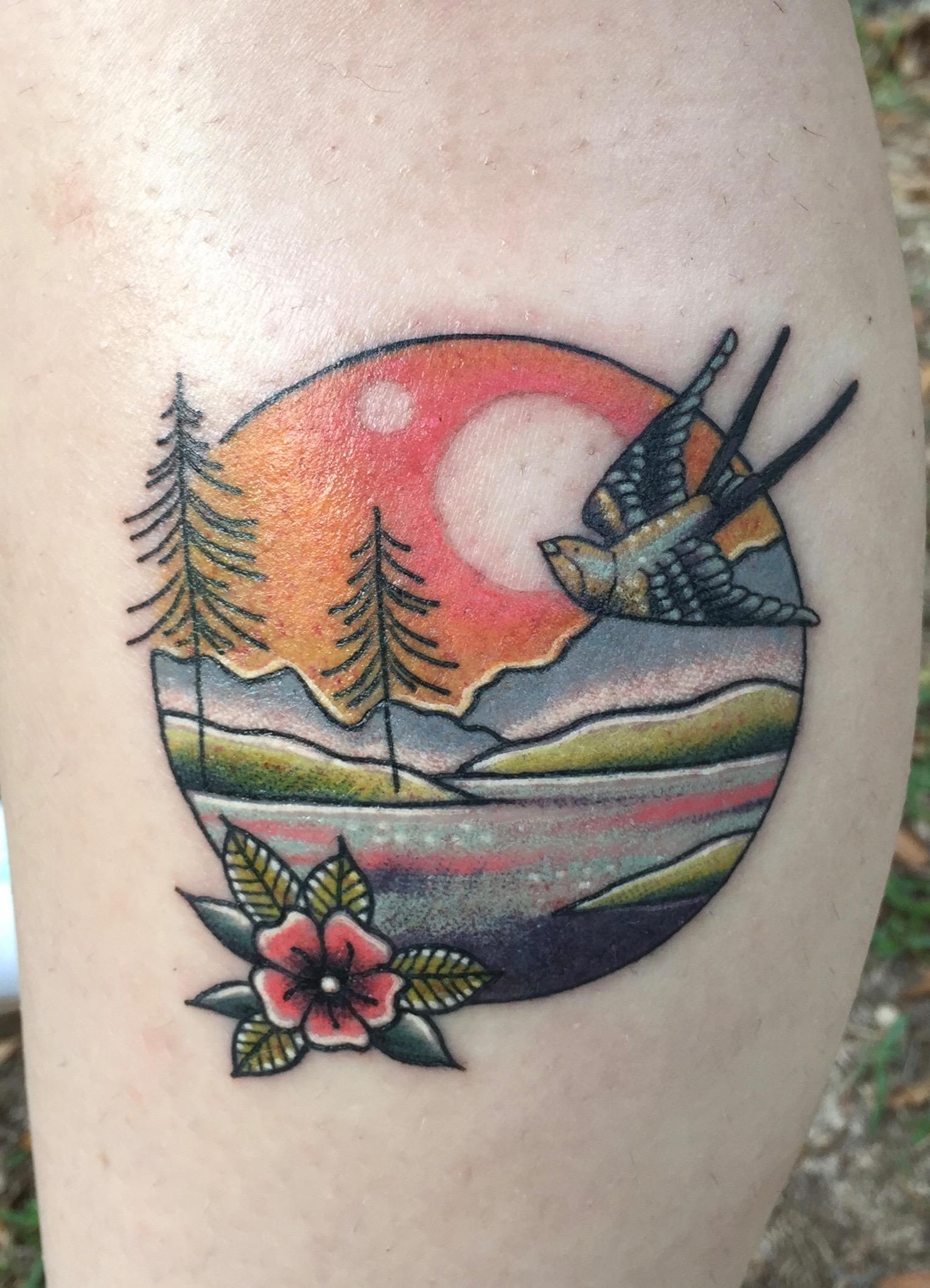 Mountain scene by Kate DeCosmo at Euphoria Tattoos in Tallahassee, Fla.
