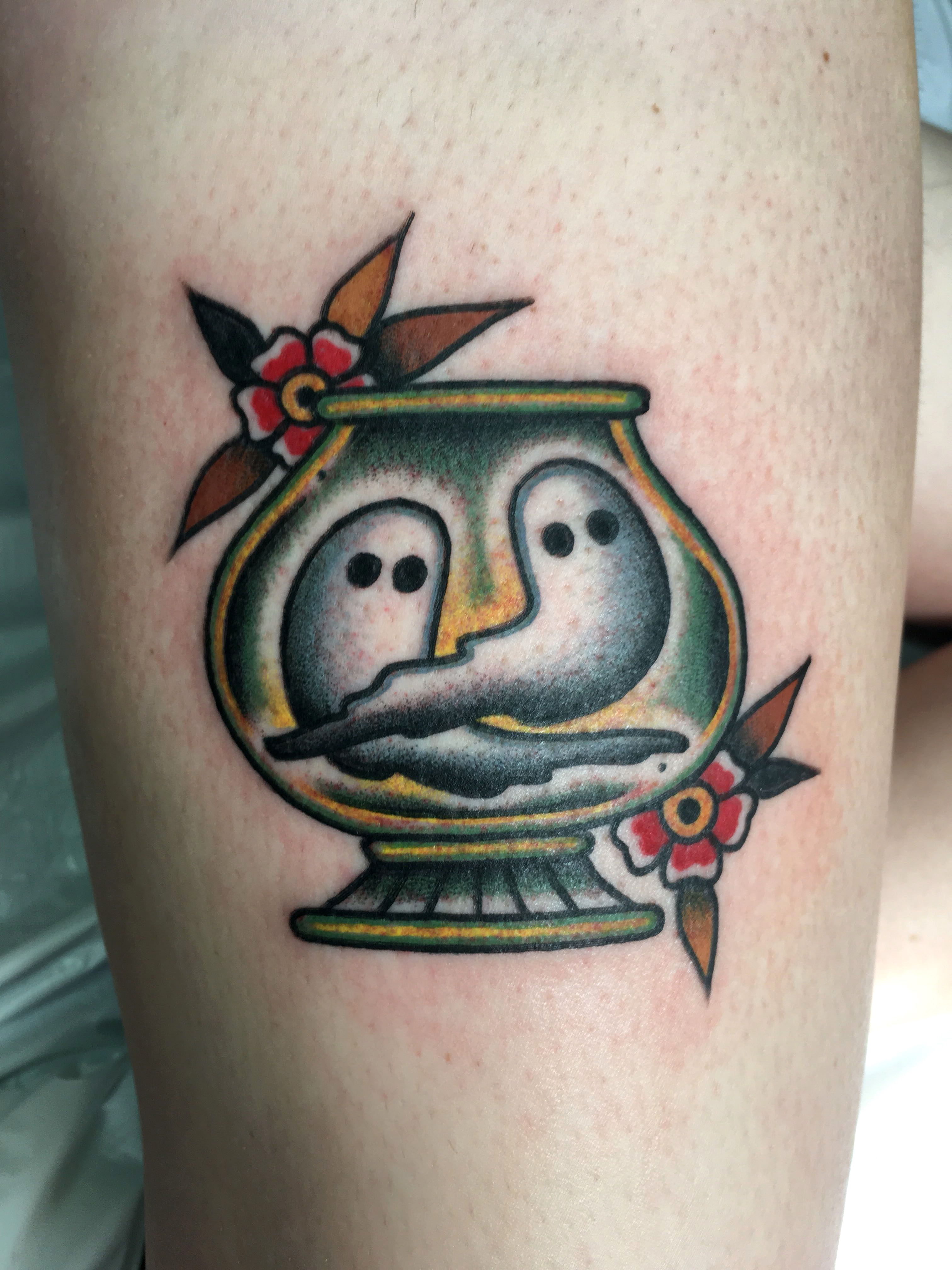 Two lost souls swimming in a fish bowl, tattoo. Done by Christos @ Wild Zero, Morgantown, WV