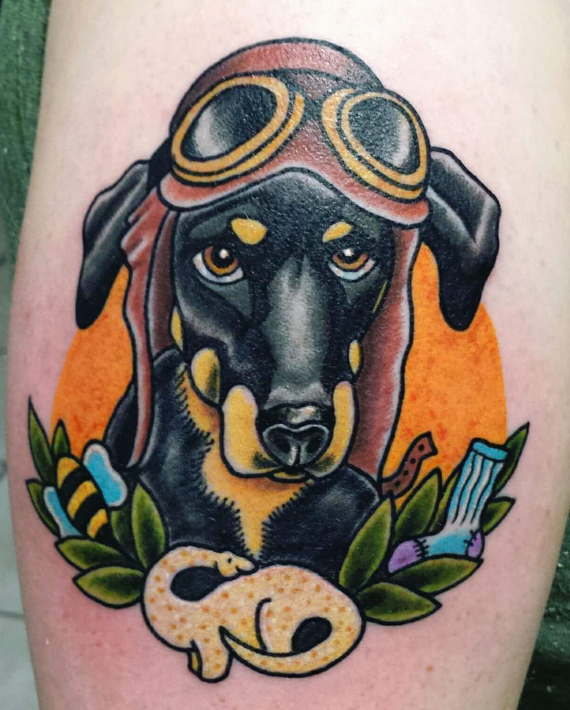 Dog with a hat and some favorite toys, tattoo, by Michaela at Nebraska Electric Tattoo in Lincoln