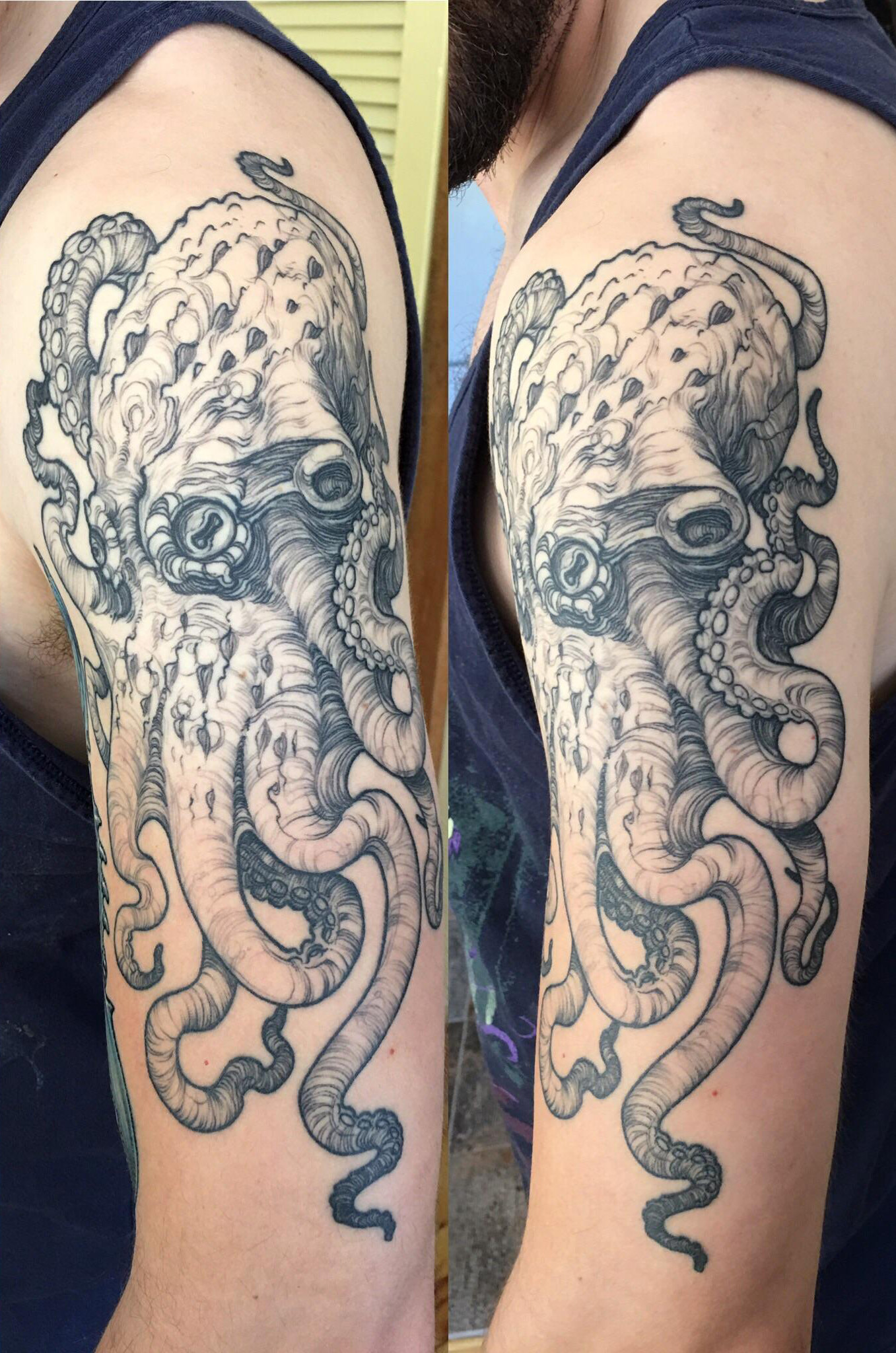 Black and grey octopus, tattoo, done by Amanda Filippetti at Glass Beetle in Santa Rosa, CA.