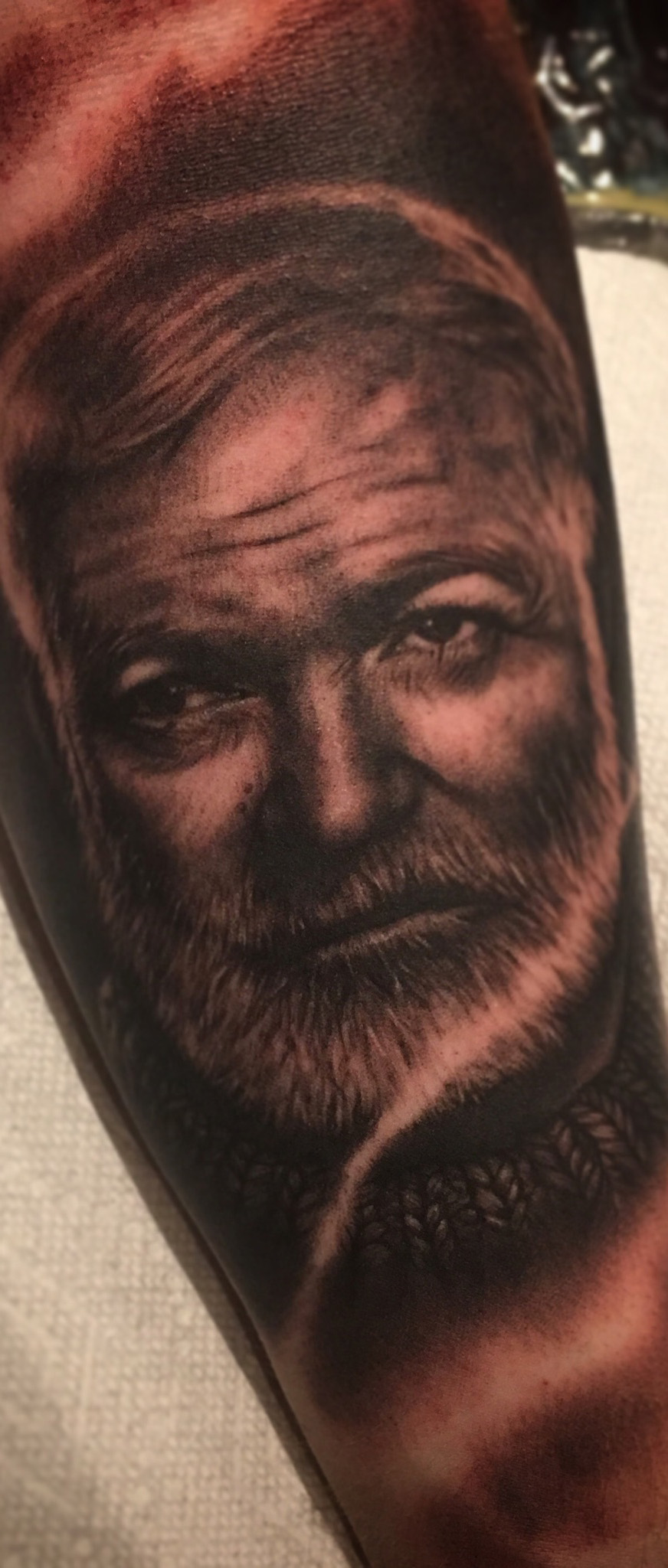 Hemingway Portrait by Deanna Smith, Dark Age Tattoo Studio, Denton, TX