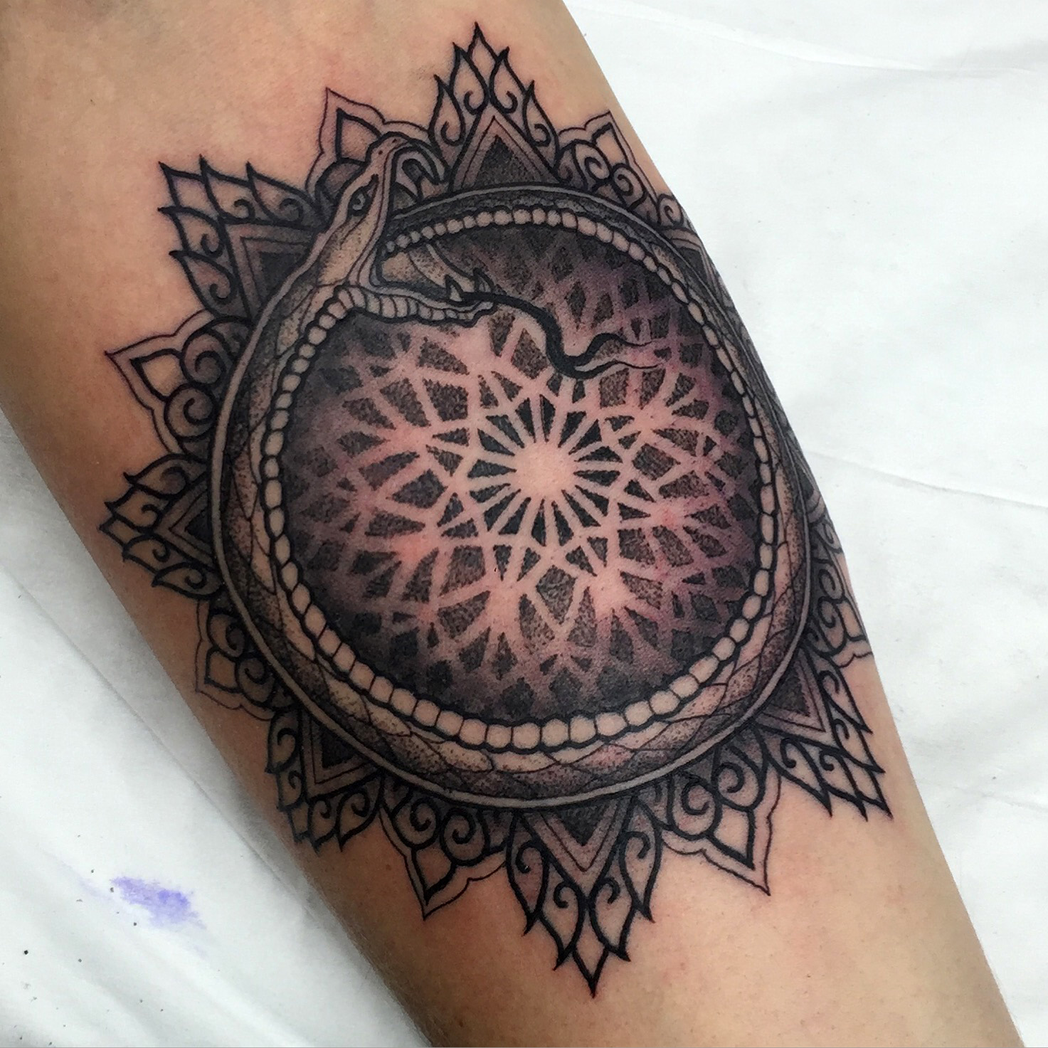 Forearm Ouroboros Mandala tattoo by Ellie Thompson @ Hibernia Tattoo Sydney #evamigtattoos #tattoo
