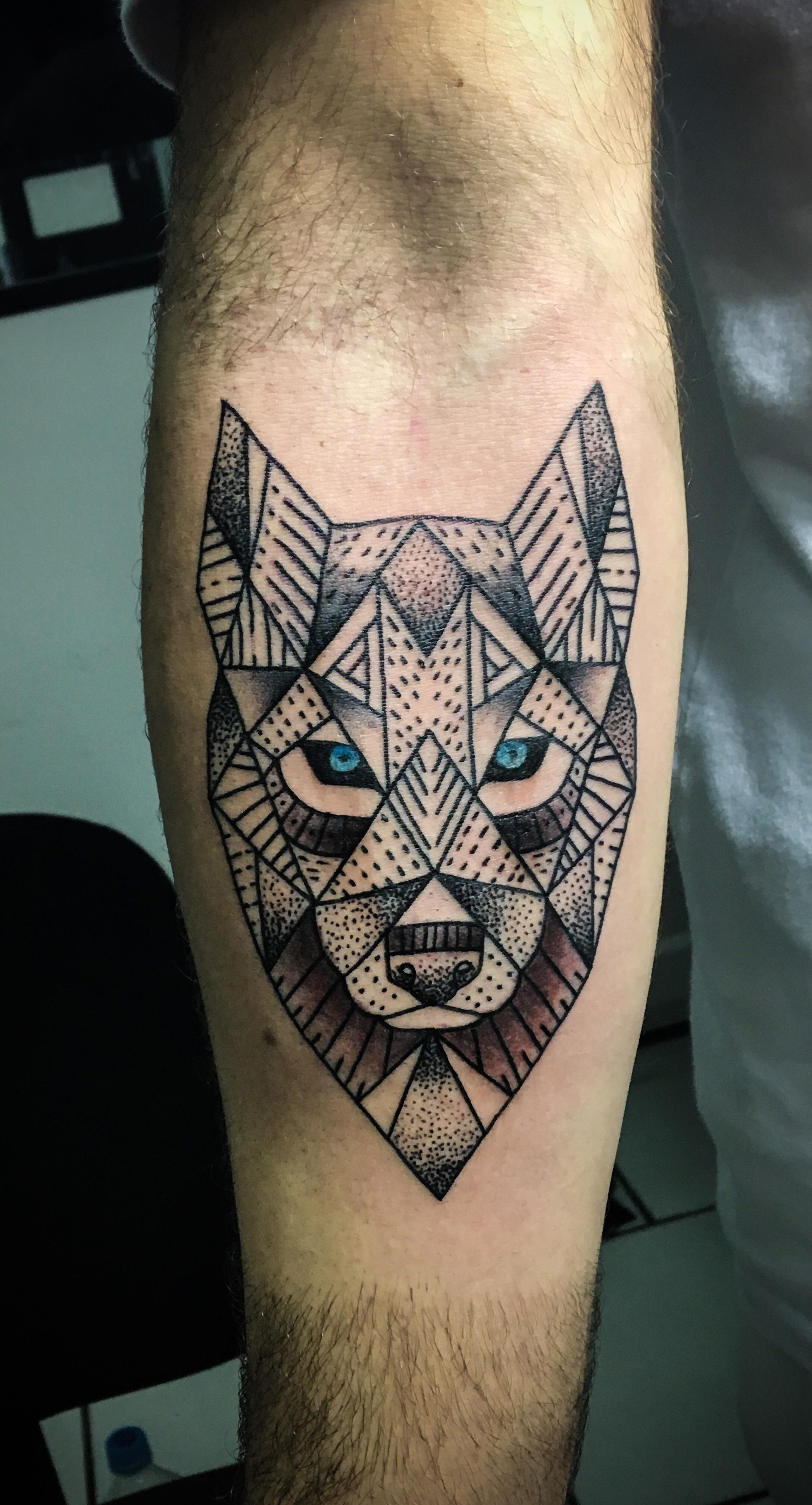 Geometric blue eyed wolf, by Kiko Fouchy at Batcat, Pelotas, Brazil #evamigtattoos #tattoo