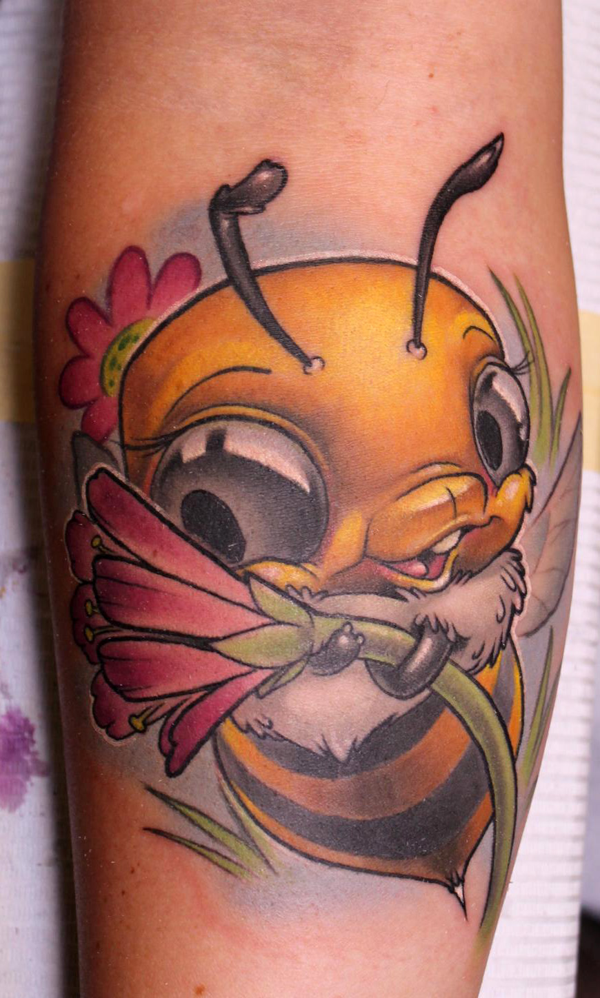 Bee hugging a flower, by at Dandyland Tattoos, San Antonio, TX