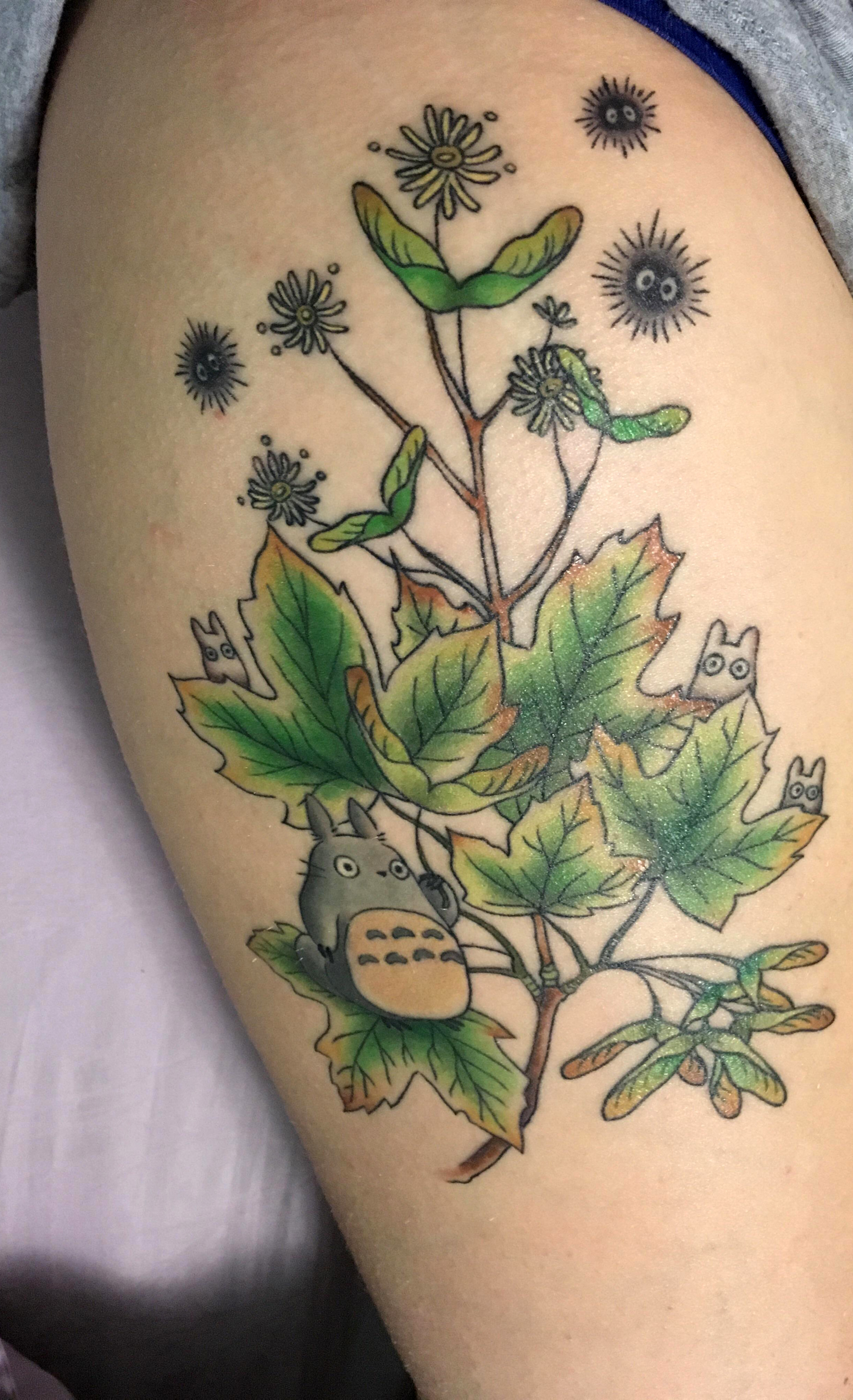 Totoro with maple leaves by Jessica Channer at Tattoo People, Toronto, ON #evamigtattoos #tattoo