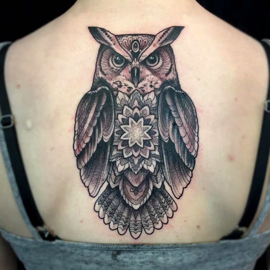 Mandala Owl Tattoo done by Adam LoRusso at Redemption Tattoo in Cambridge, MA #evamigtattoos #tattoo