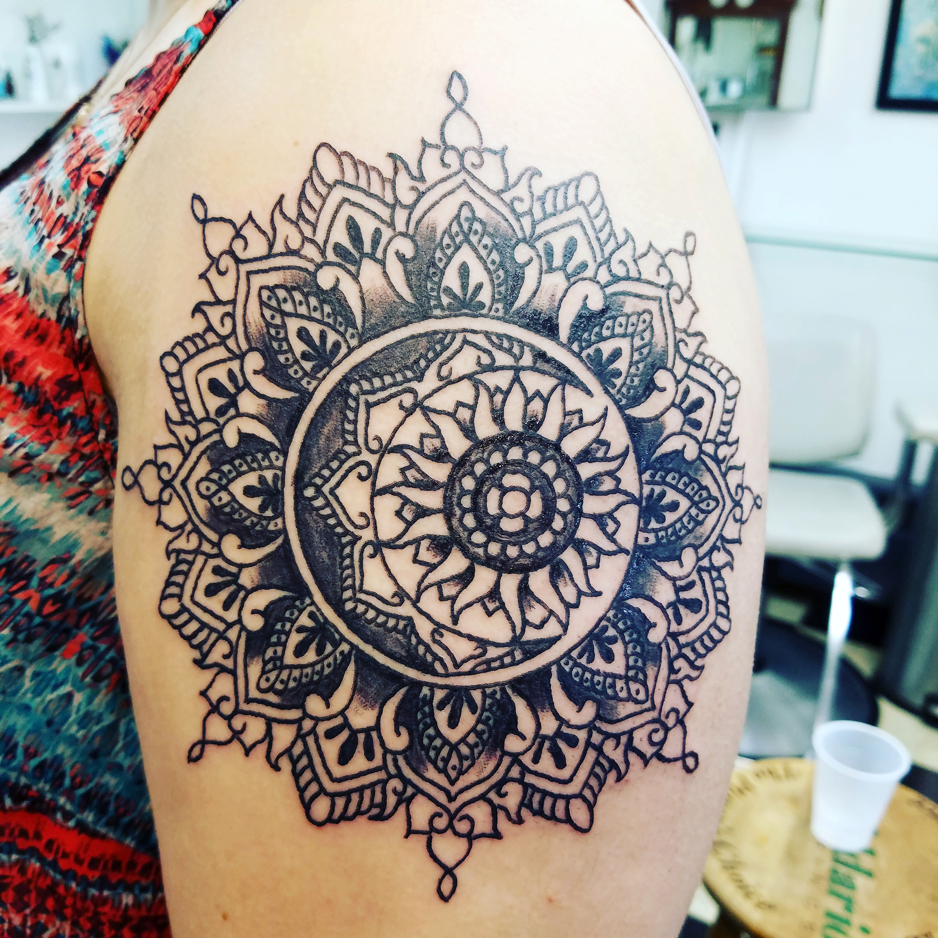 Sun and moon mandala tattoo done by Brian at Lakeview in Michigan #evamigtattoos #tattoo