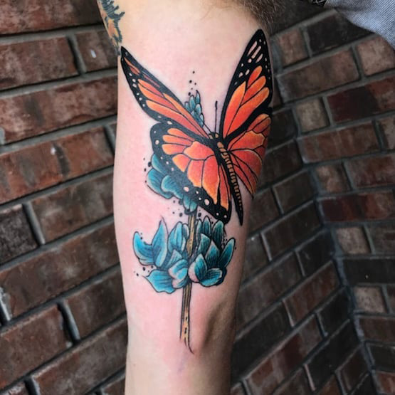 Butterfly on a bluebonnet done by Zach Rench at Dark Mark Gallery in Mansfield, TX #evamigtattoos