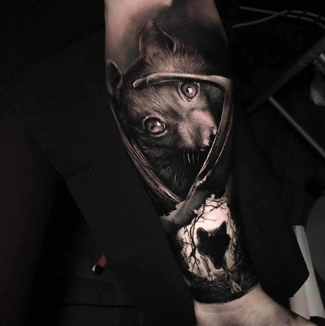 Bat tattoo. Black and grey tattoo by Thomas Carli Jarlier