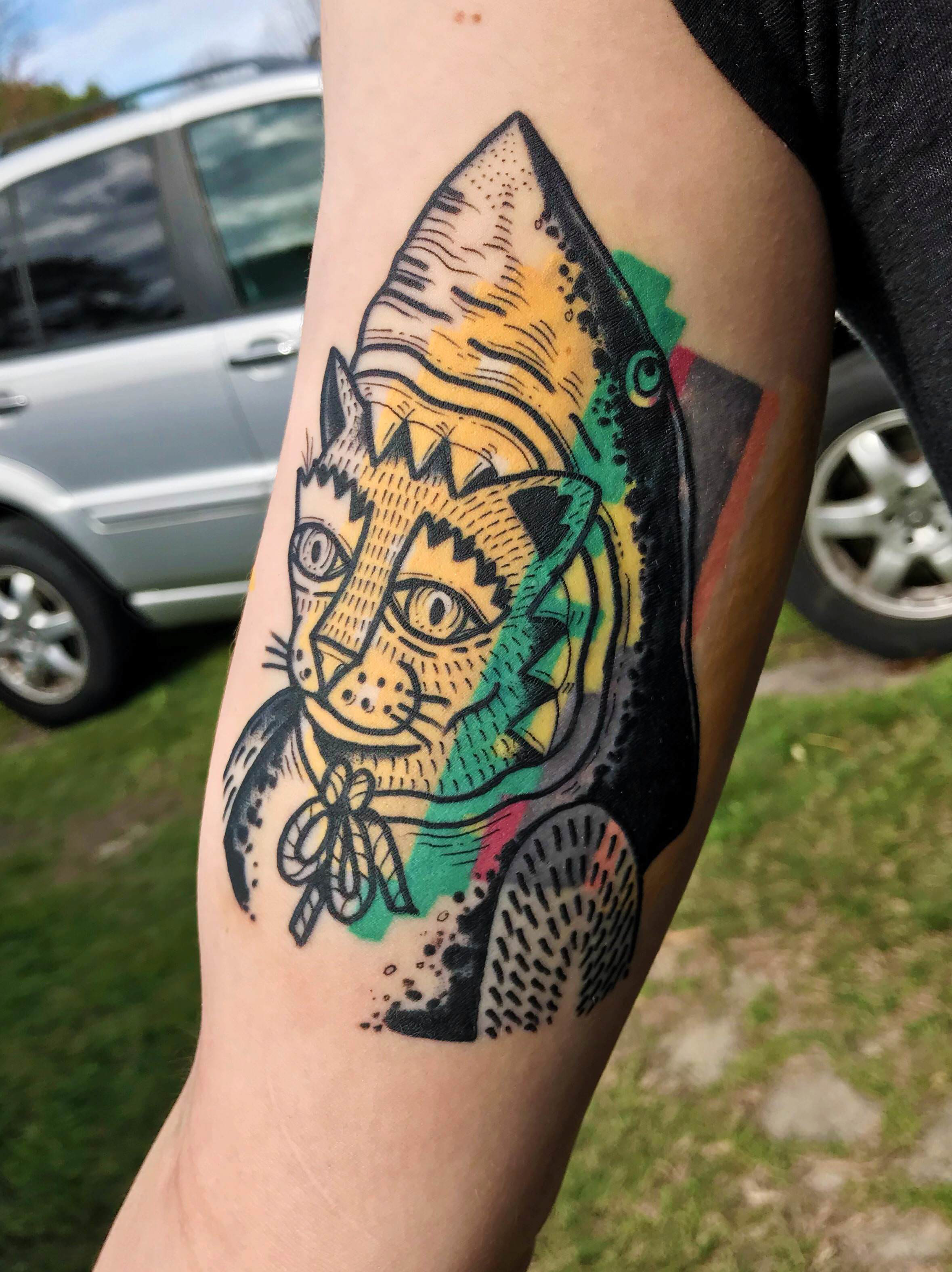 a cat wearing a shark hood by Shawn Dougherty @ Good Graces in Wilmington, NC #evamigtattoos #tattoo