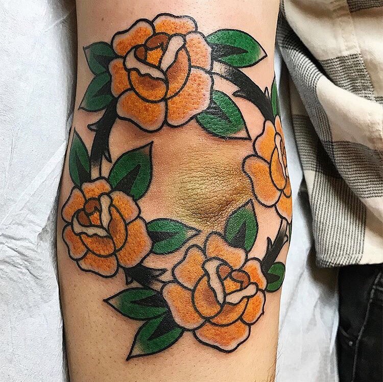 Rose band around elbow. Done by Lisa @ Historic Tattoo Society, Portland, OR #evamigtattoos #tattoo