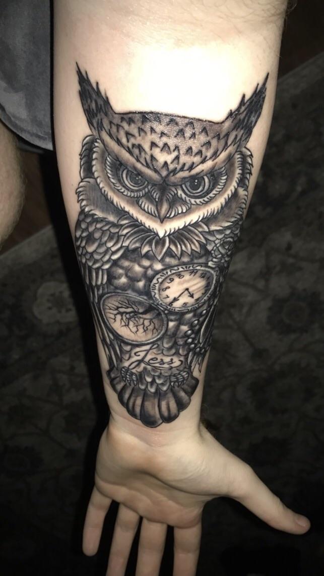 Owl tattoo, pocket watch and name, by Nikki Sailor @ Monster INK Liverpool, uk #evamigtattoos