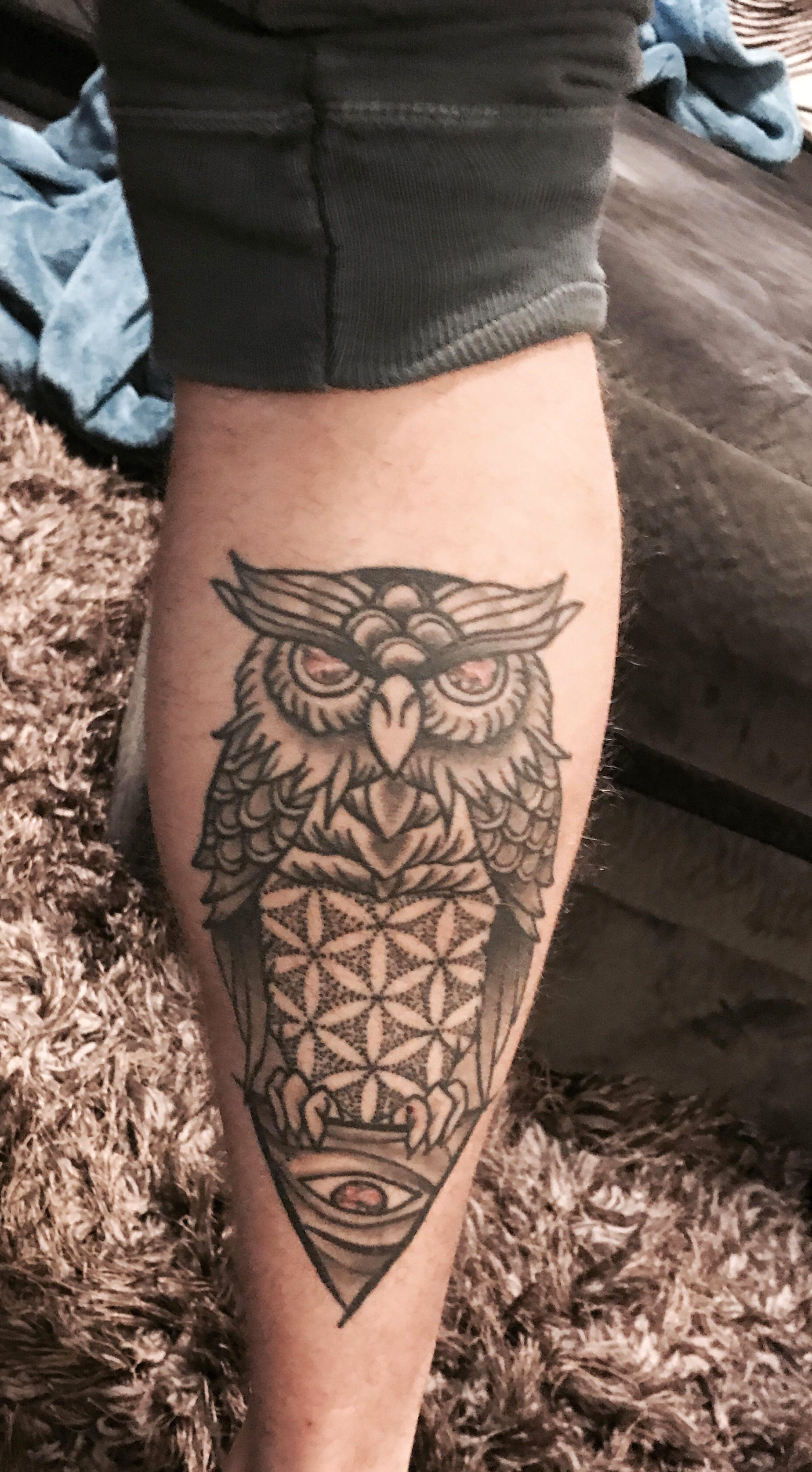 Owl tattoo done by Vance Bishop at Stay Bold tattoo shop in Florence, AL #evamigtattoos #tattoo