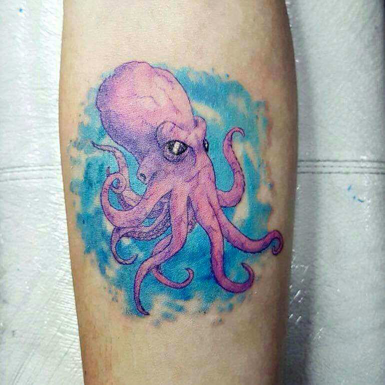 Pink octopus by Eugene at Motif Tattoos in Tashkent, Uzbekistan #evamigtattoos #tattoo