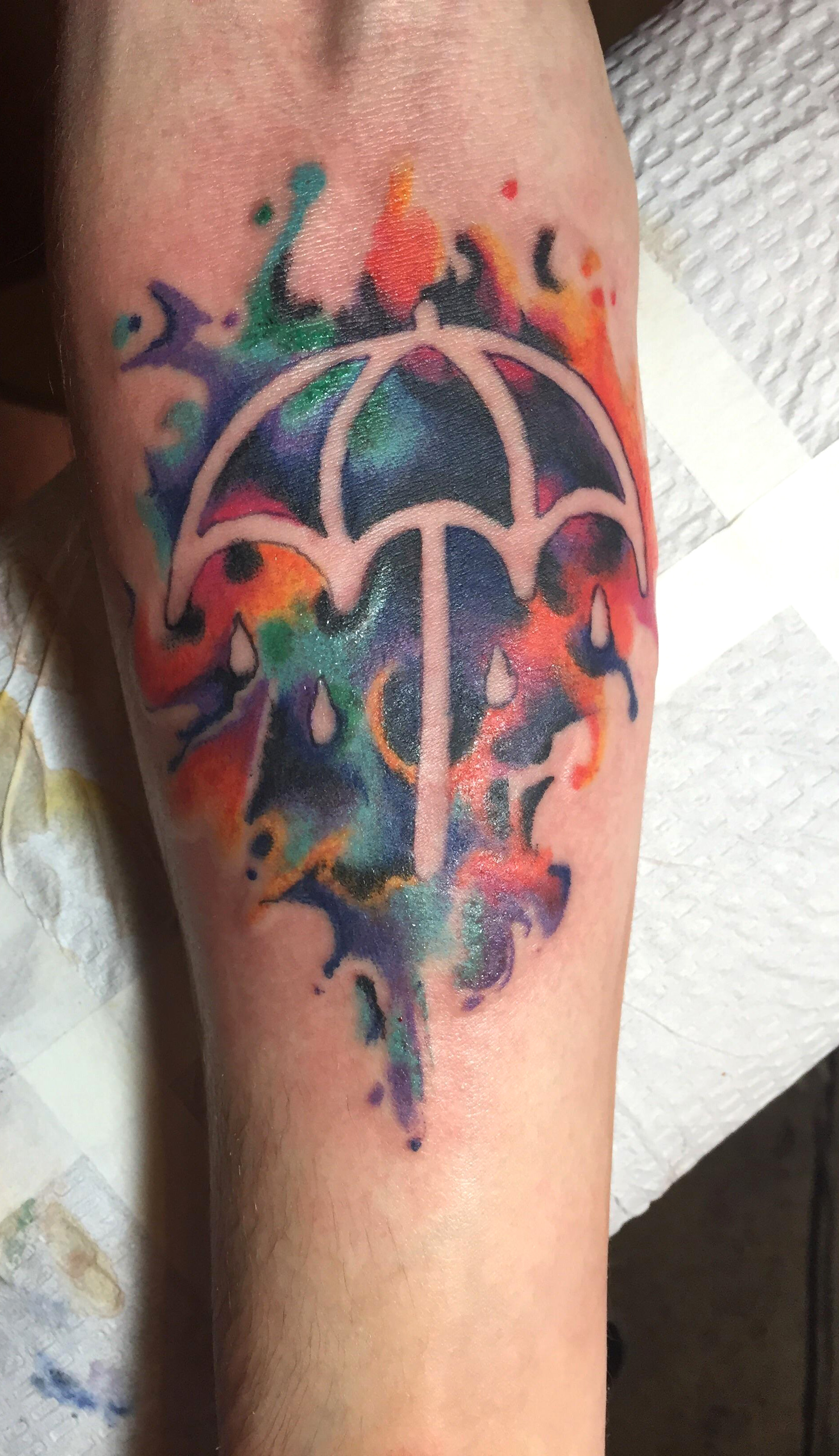 Umbrella watercolor tattoo by Justin Schmidt at Dreams Collide in Lancaster, PA