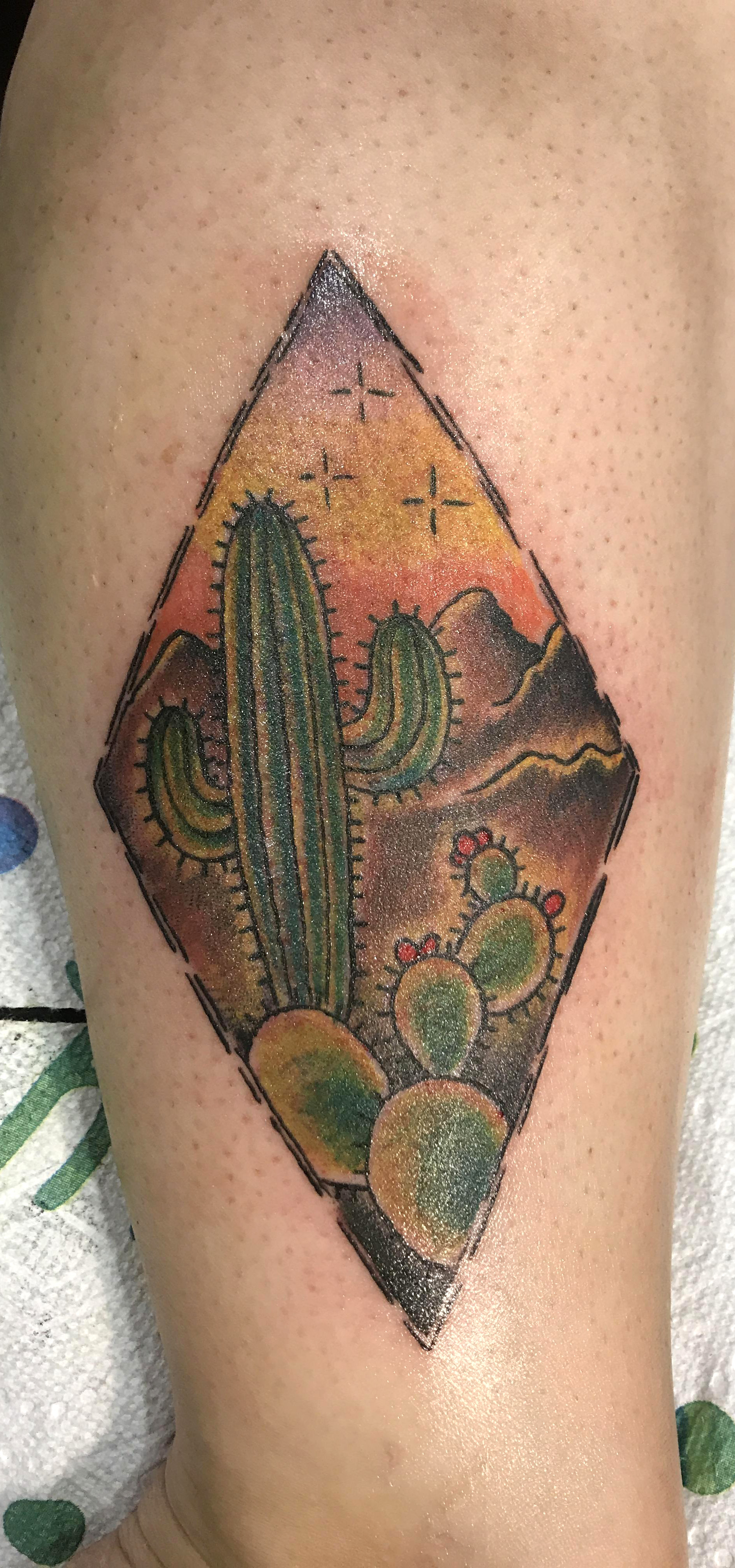 Cactus tattoo. Desert scene by Charlie at Studio 21 Tattoo Studio in Las Vegas, NV