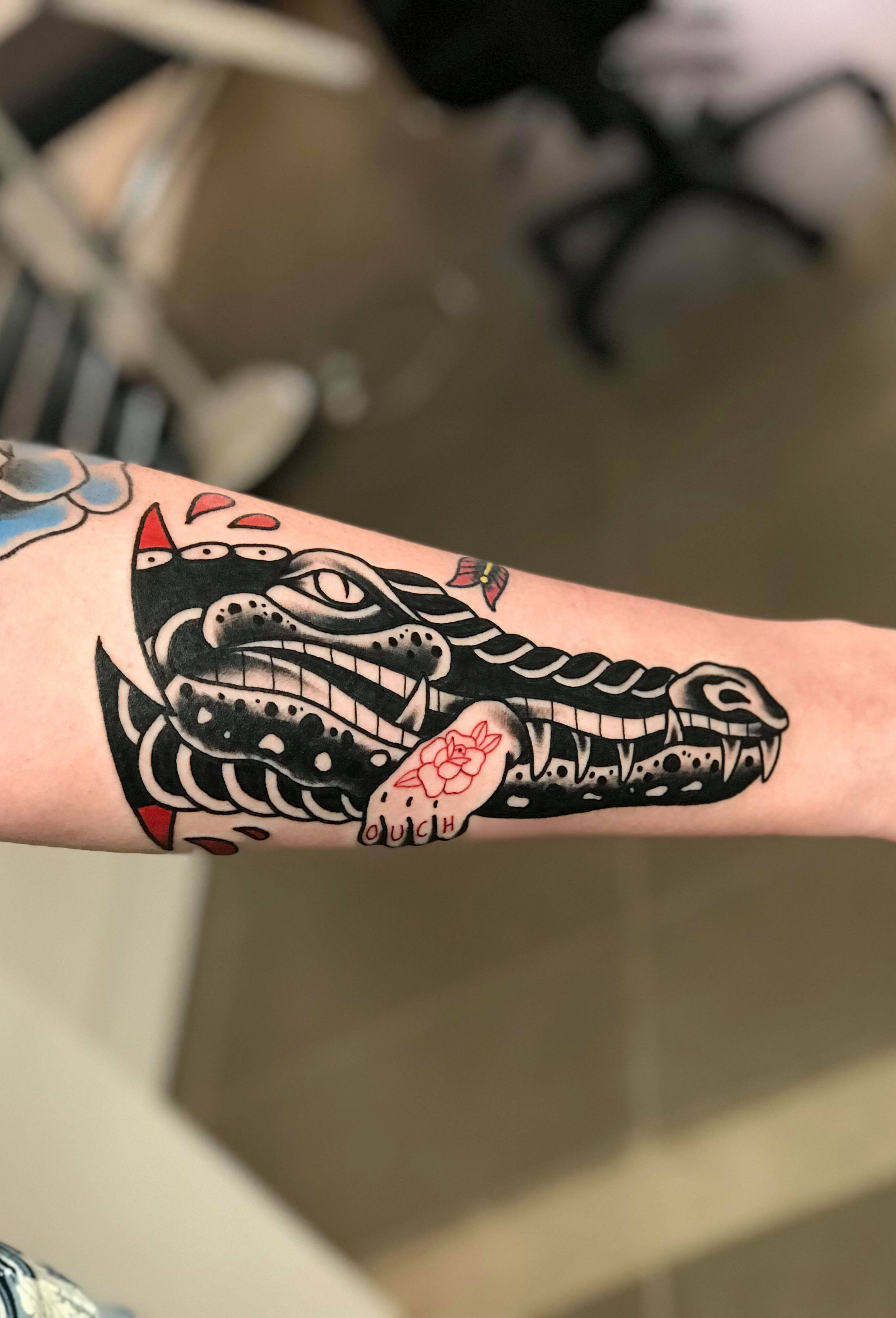 Black traditional crocodile done by Paro at the Tattoo Movement in Enmore, Australia #evamigtattoos