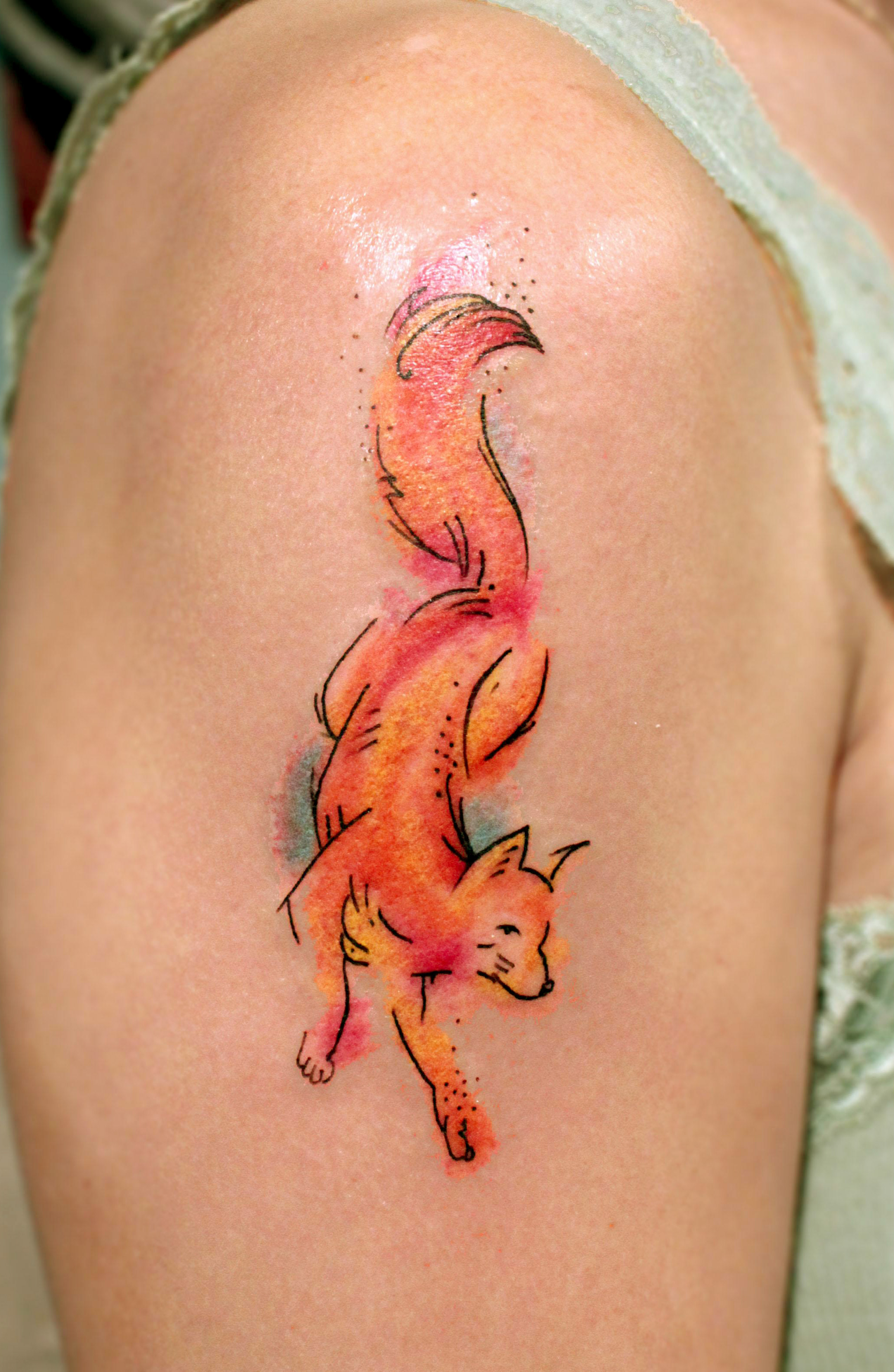 Watercolor fox tattoo by Oliva at Astral View Studios in Marble Falls, TX #evamigtattoos #tattoo