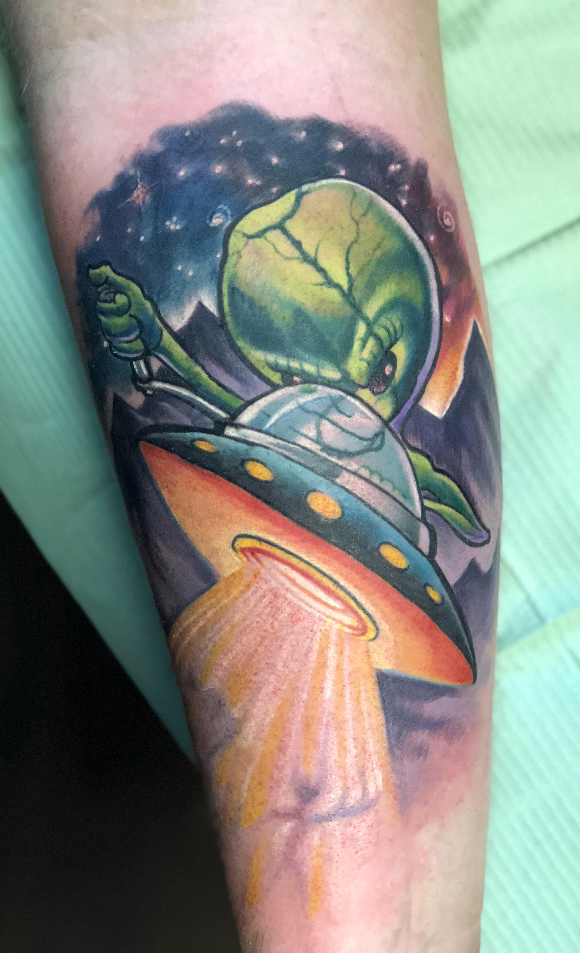 UFO tattoo Done by Ande spade at raven rose tattoo in pinellas park, FL #evamigtattoos #tattoo
