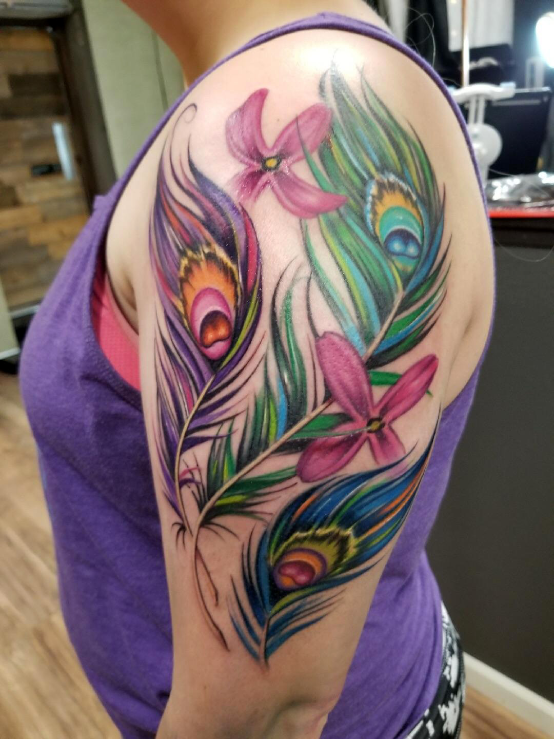 Peacock feathers and lilac blossoms by Moses Veliz at Gold Dust Tattoos in Dallas, TX #evamigtattoos
