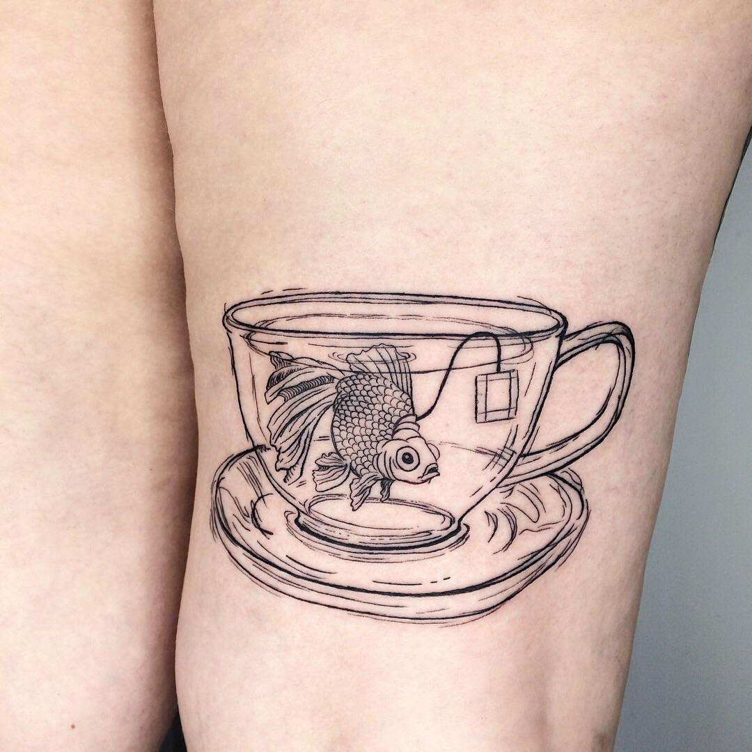 Sweet little fishy in a teacup by Bailey Jörk at Rat Tat Studio in Indianapolis, IN #evamigtattoos