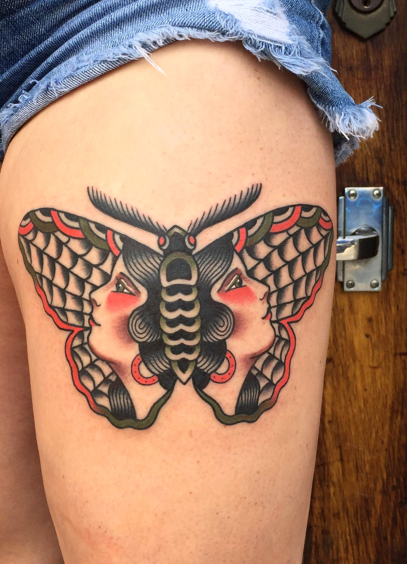 Lady face moth tattoo by David Armacost at Designs by Dana in Cincinnati Ohio