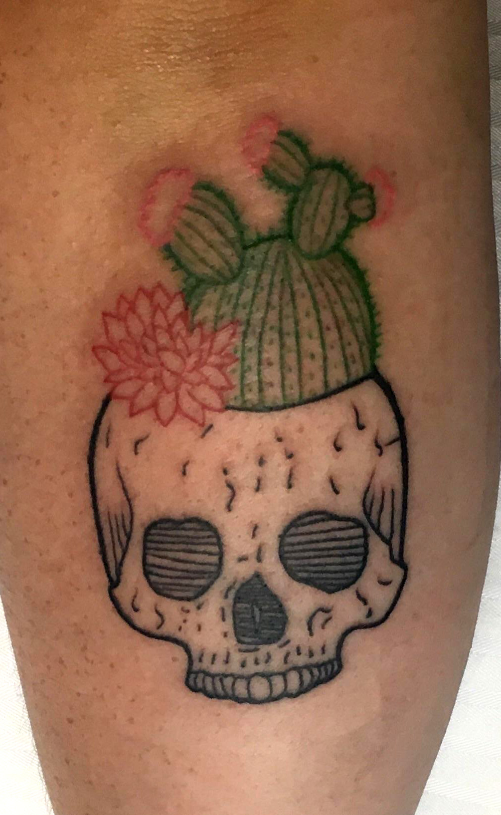 Skull and cactus tattoo done by Toi Unholy of Black Cat Tattoo in Puerto Vallarta, Mexico