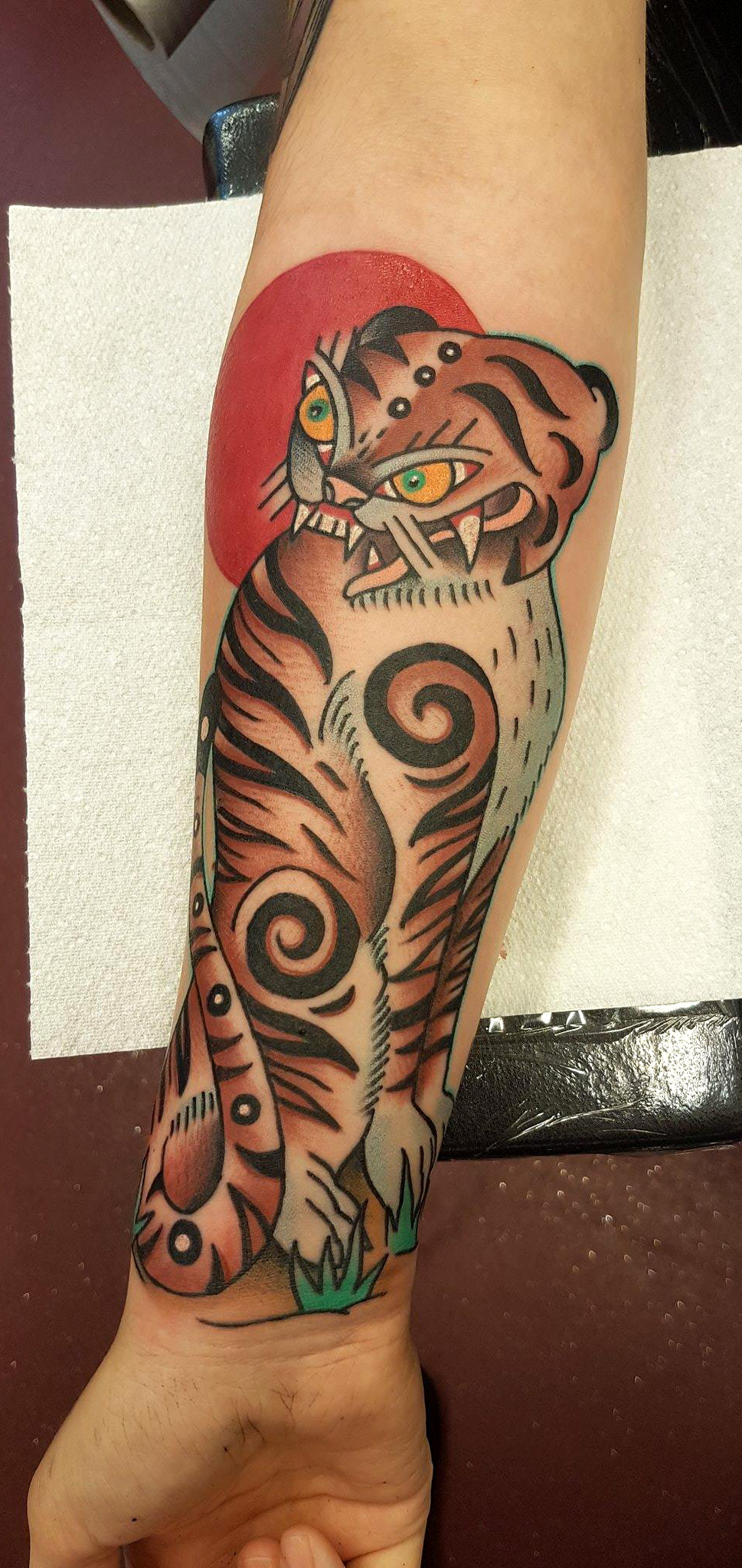 Awesome forearm tiger tattoo by Alex Bach at Flaming Gun, Colchester