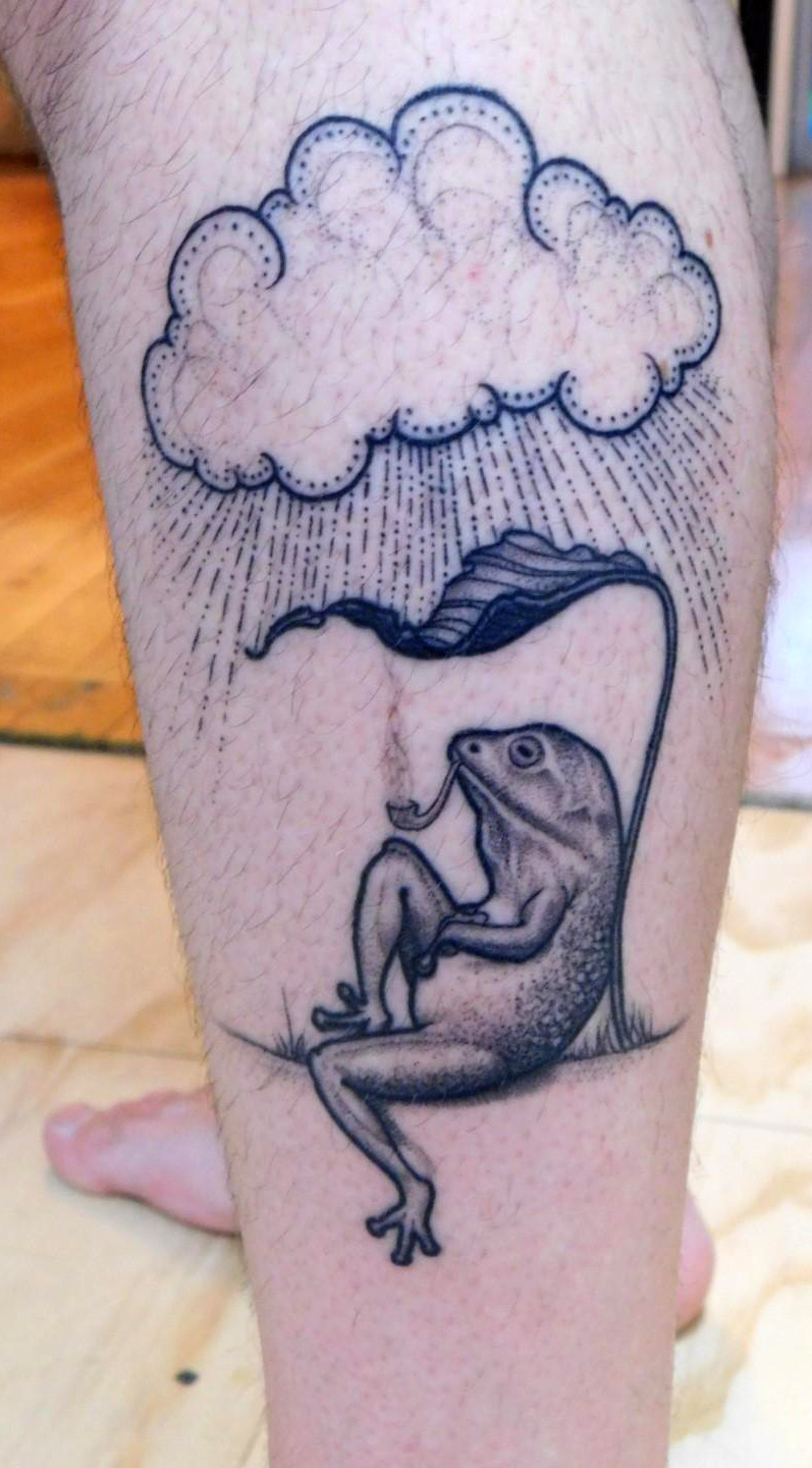 Frog smoking a pipe in the rain, by Hiren Patel at Get Up Tattoo Society in Cincinnati