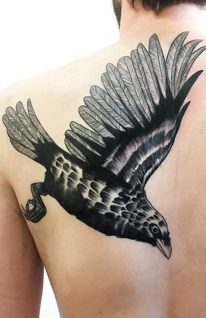 Raven tattoo by Regina Larre Campuzano at Modern Electric in Berkeley, CA