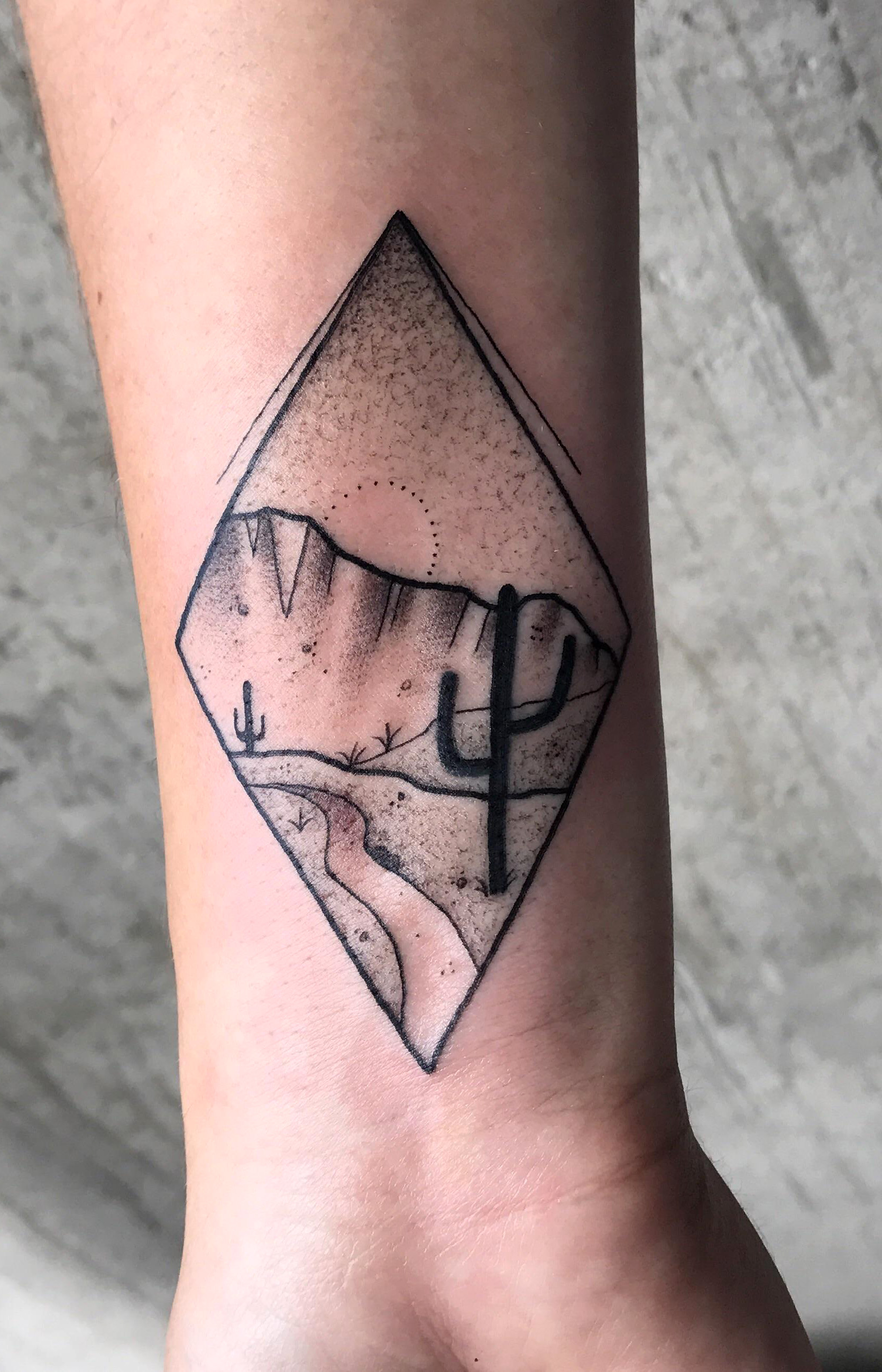 Cactus tattoo. Desert scene by Anthony at 27 Tattoo Studio in Phoenix, AZ