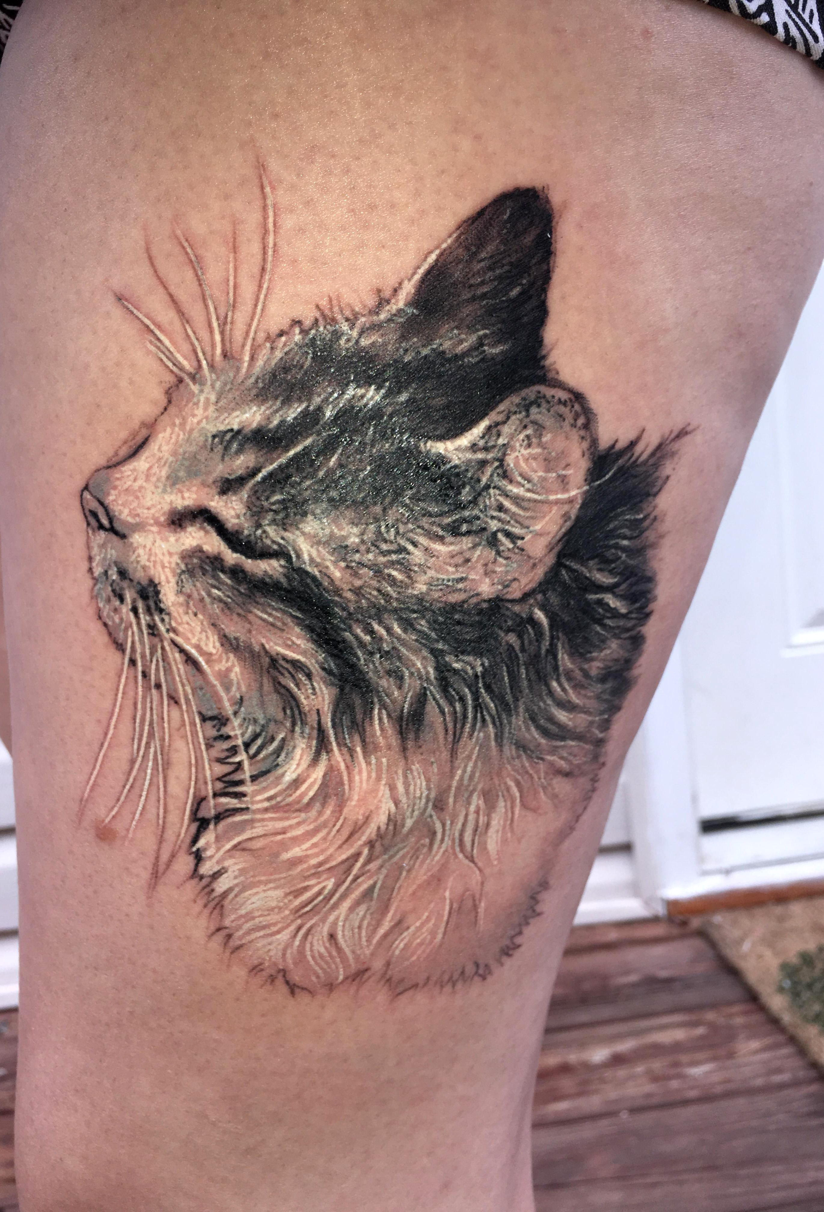 Cat tattoo Done by Christopher Nash at Evermore Galleries in Chattanooga, Tennessee