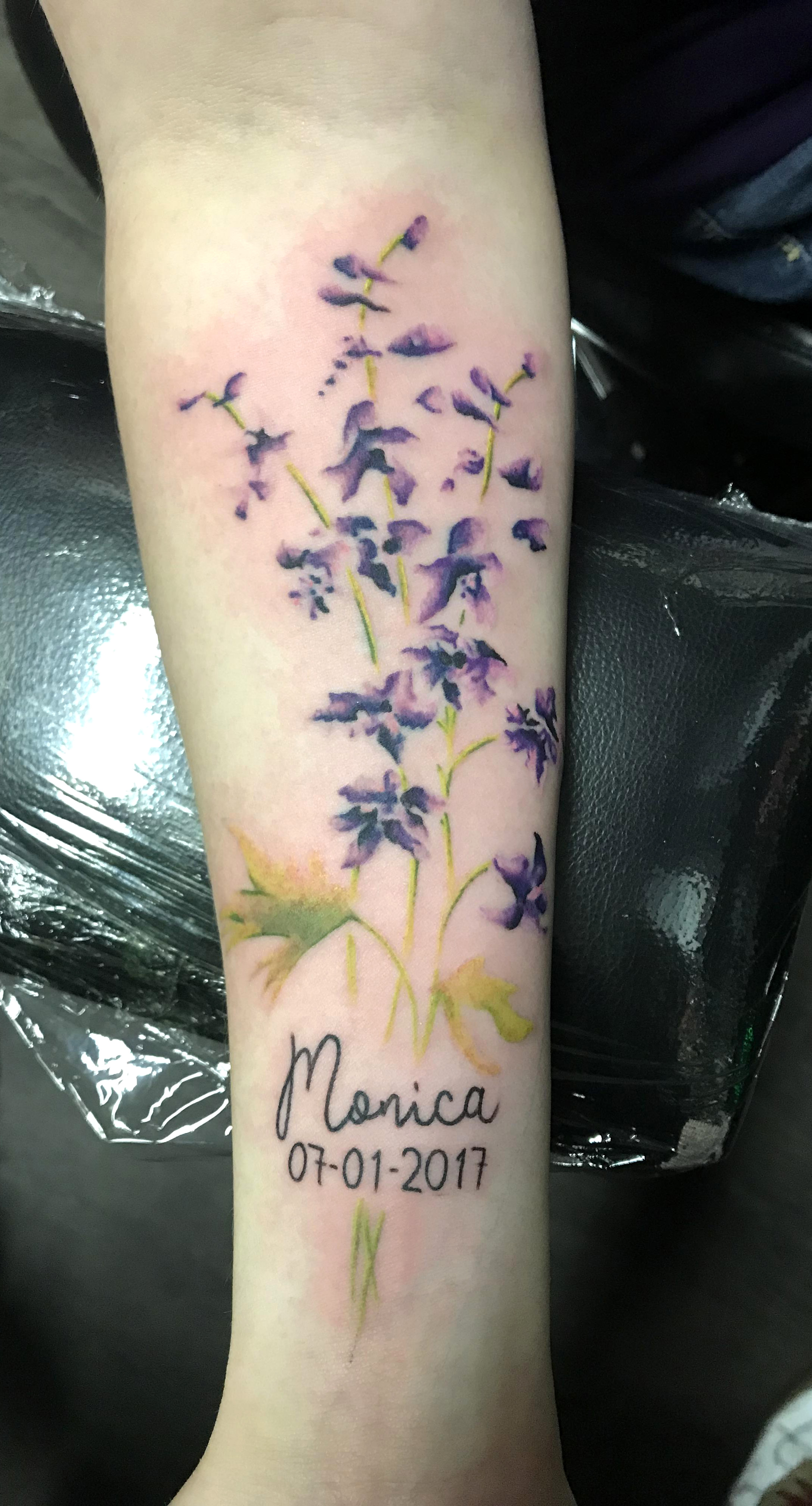 Larkspur flower by Walker Sparks at Lost Soul Tattoo in Hampstead, NC #evamigtattoos #tattoo