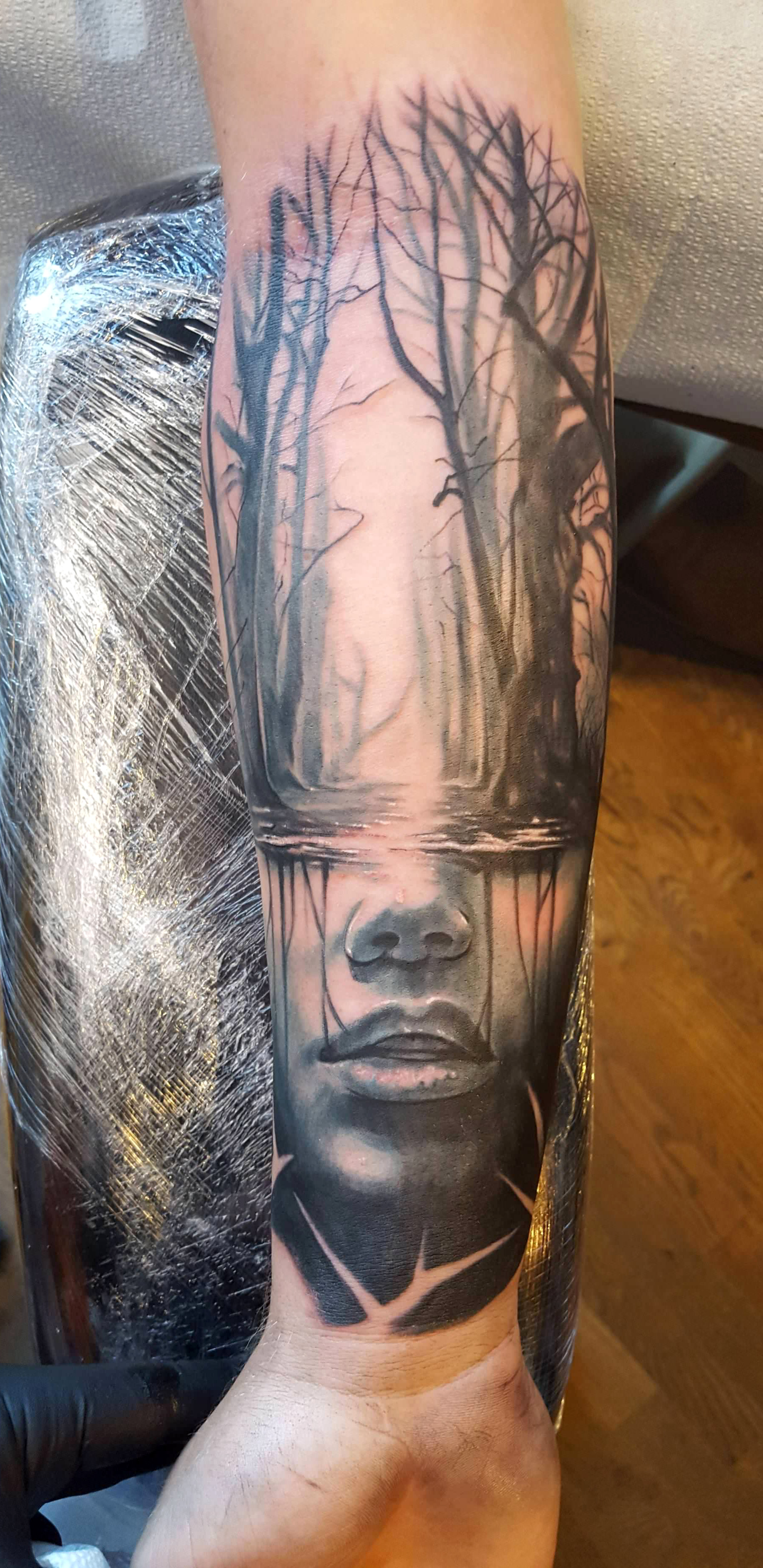 Forest tattoo sleeve by Mark Fettig, Honest to Goodness, Grand Rapids