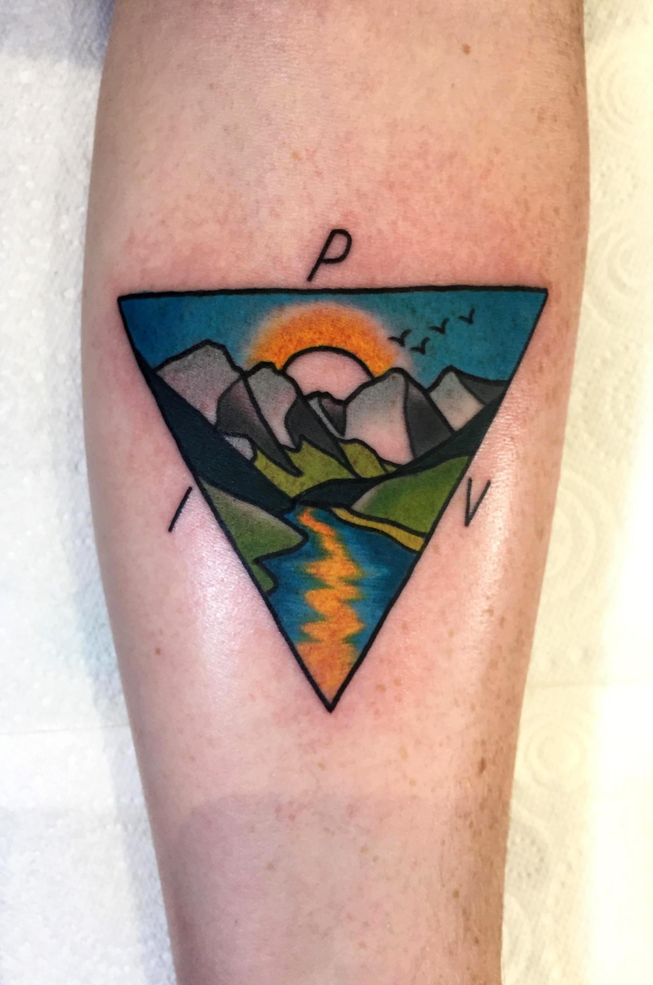 Mountain sunset tattoo by Jack Goks @ Cloak & Dagger. London, UK