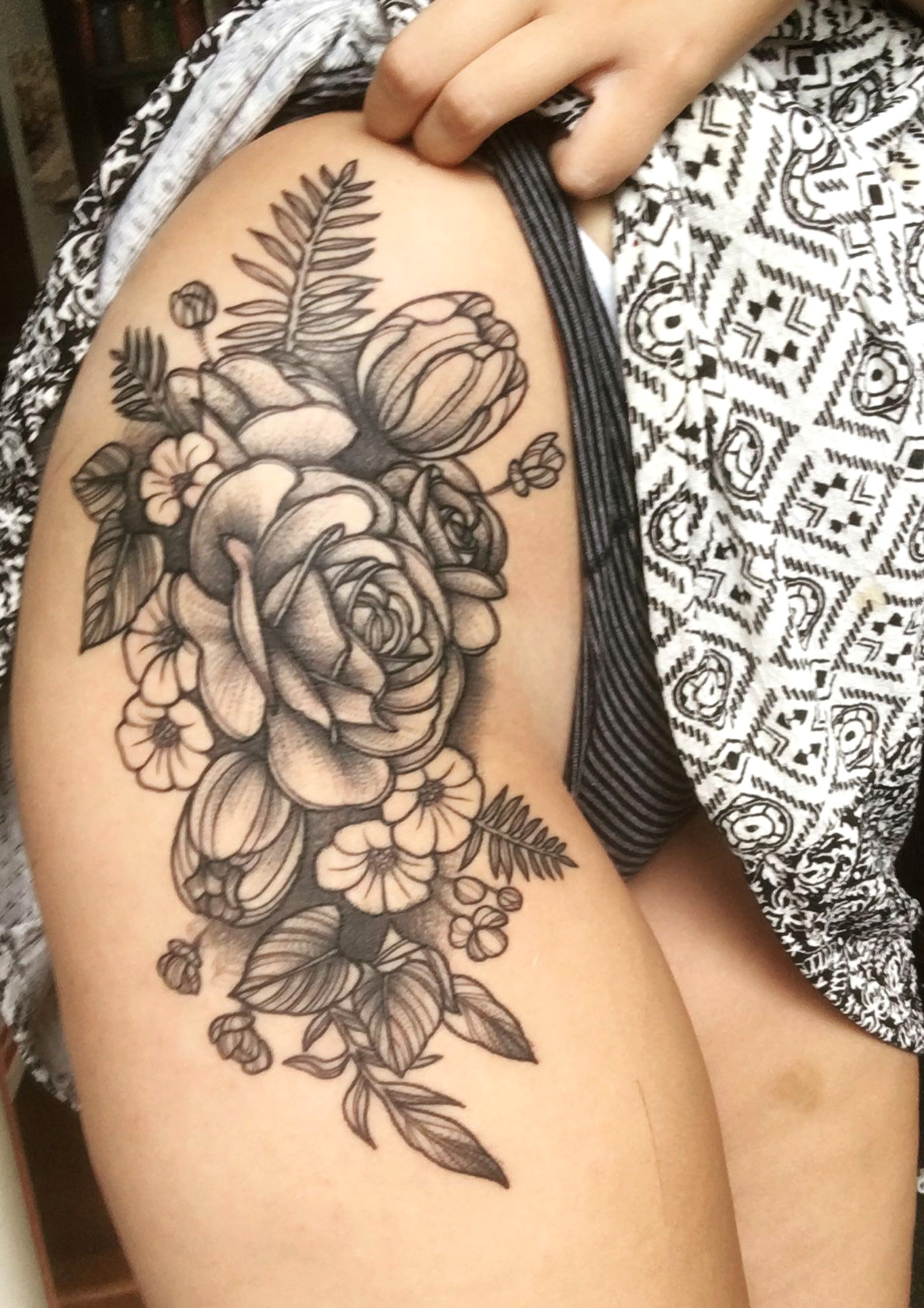 Floral hip tattoo by Logan Bramlett at Wanderlust Tattoo Society in Akron, OH