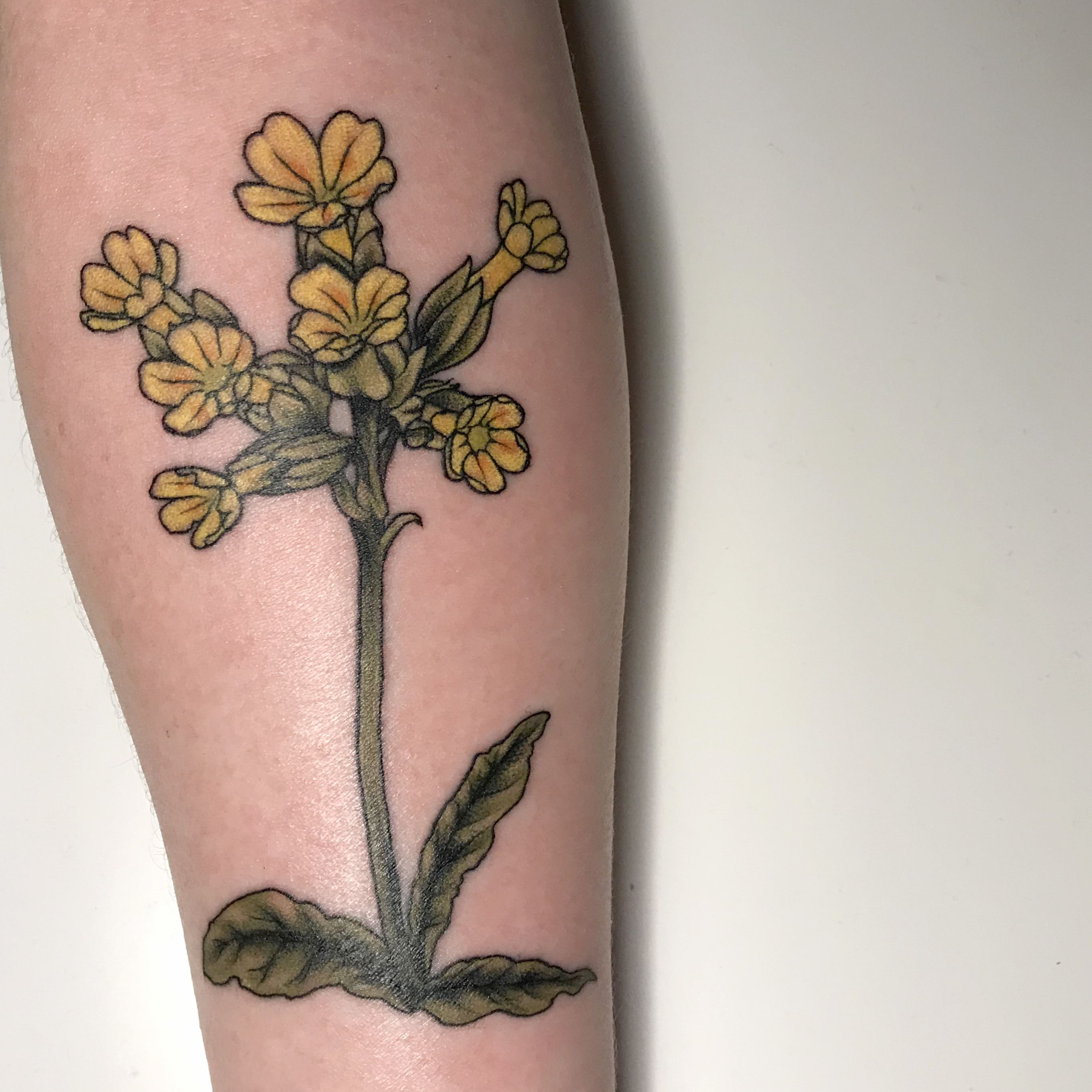 Cowslip flower by Rae Robinson @ Crooked Claw Tattoo, Sheffield, UK #evamigtattoos #tattoo