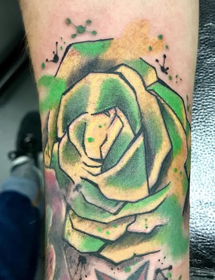 Yellow and Green spray paint rose by Nathan at Devil's Own Tattoos in Leicester, UK #evamigtattoos