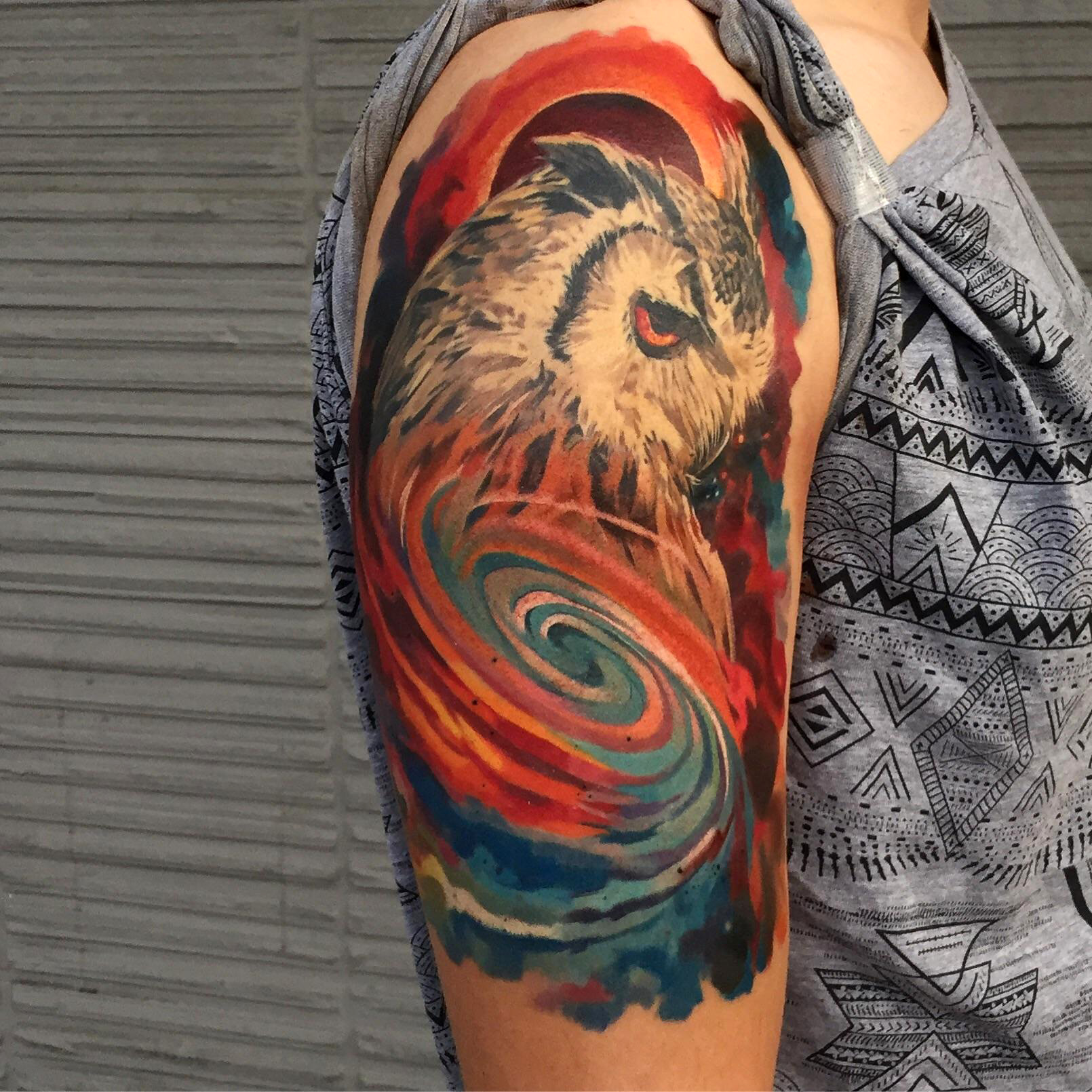 Owl and The Galaxy by Adrian Franco at Paper Crane Studio, Long Beach, California #evamigtattoos