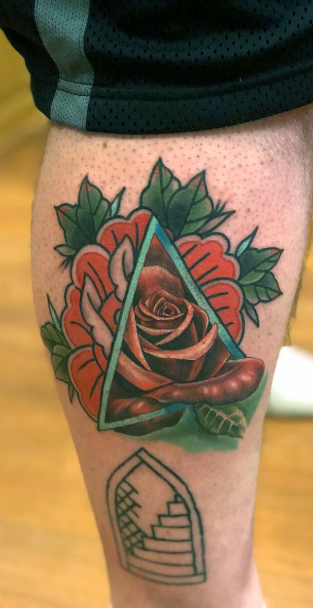 Traditional Realism Rose collaboration done by Cy Sterling and Ryan Thomas at Goodfellow Tattoo Club