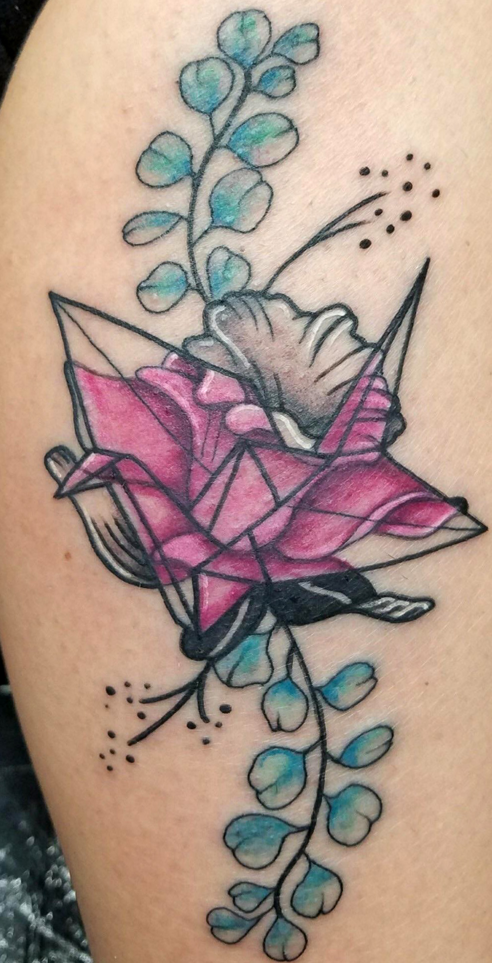 Origami crane tattoo. Ken Olea of Fiendz Body Art. Modesto, CA