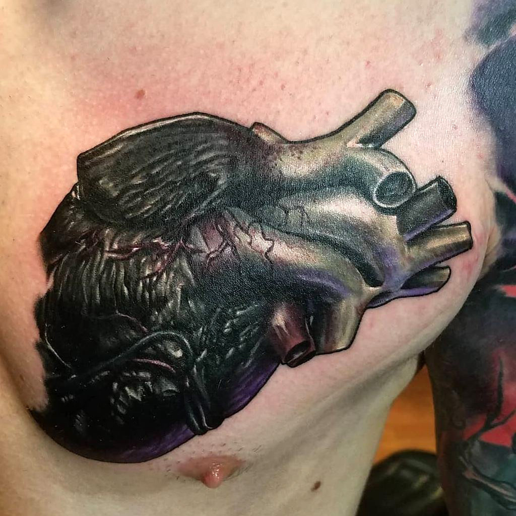 Black Heart of chest piece, done by John Lally @ Masquerade Tattoo, Ridge, NY #evamigtattoos #tattoo