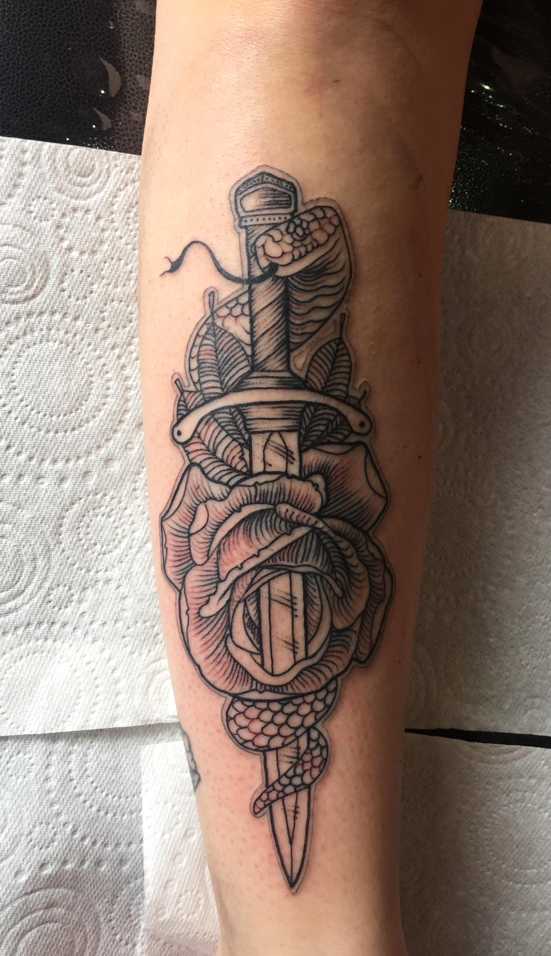 Beautiful snake and dagger on my shin, tattooed by Rae @ Skins and Needles, Middlesbrough
