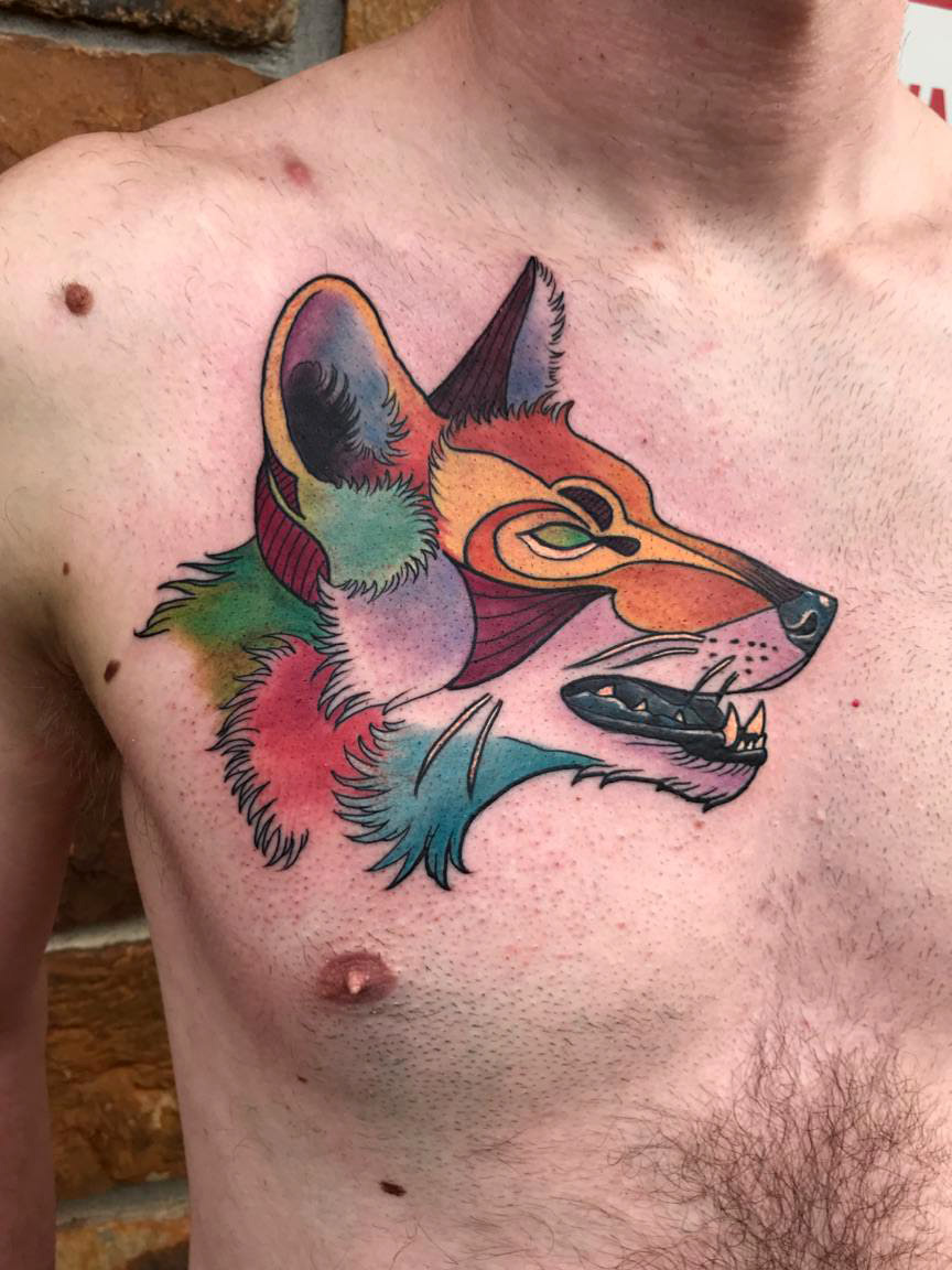 colorful coyote, by Jacob at Cherry Street Tattoo, Tulsa, OK #evamigtattoos #tattoo