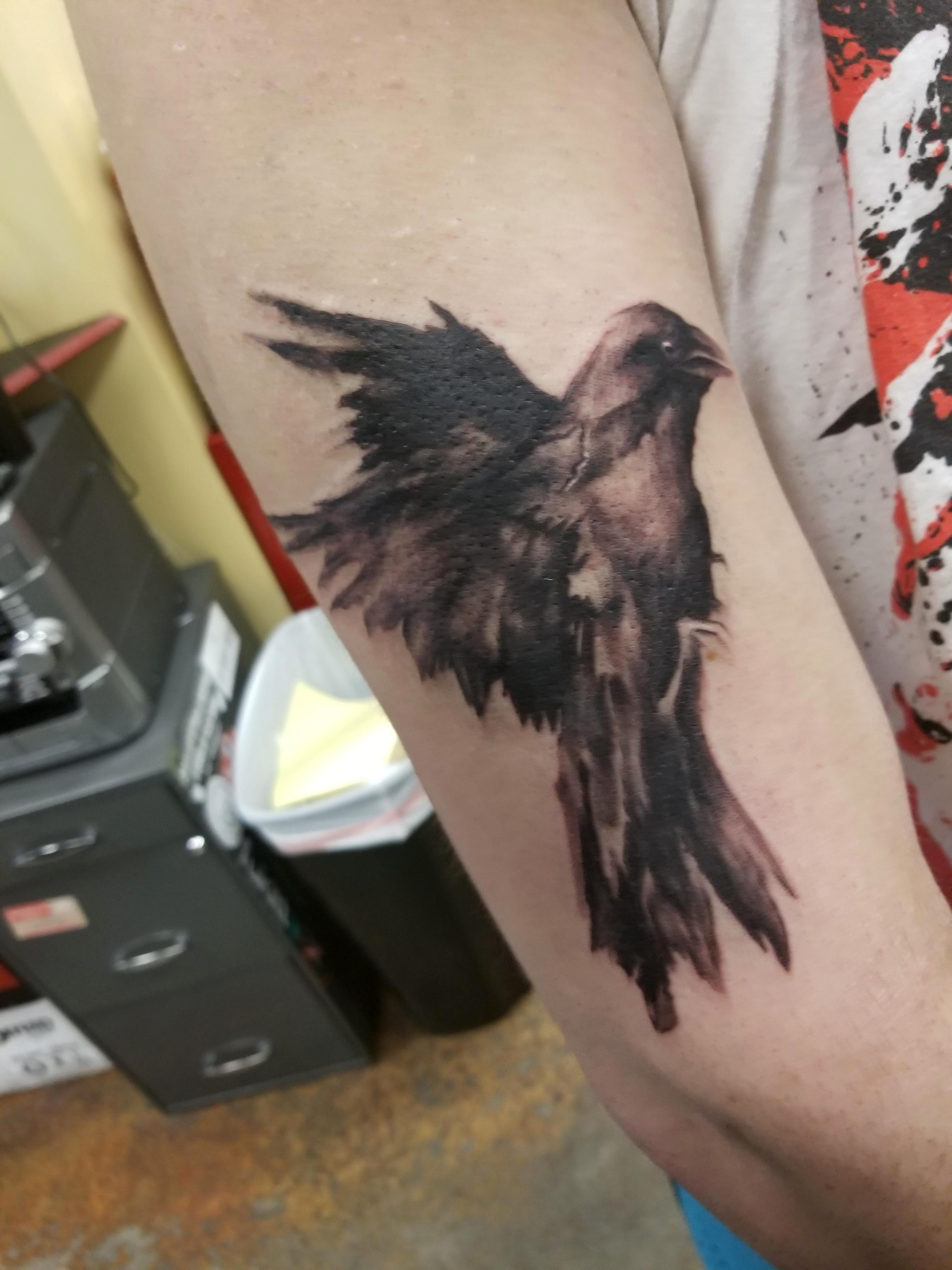 Watercolor Raven by David at Wicked 13 New Orleans, LA #evamigtattoos #tattoo