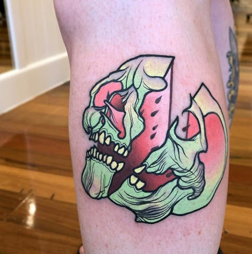 Watermelon Skull. By Alex Bock at Oak and Iron Tattoo, Brisbane QLD #evamigtattoos #tattoo