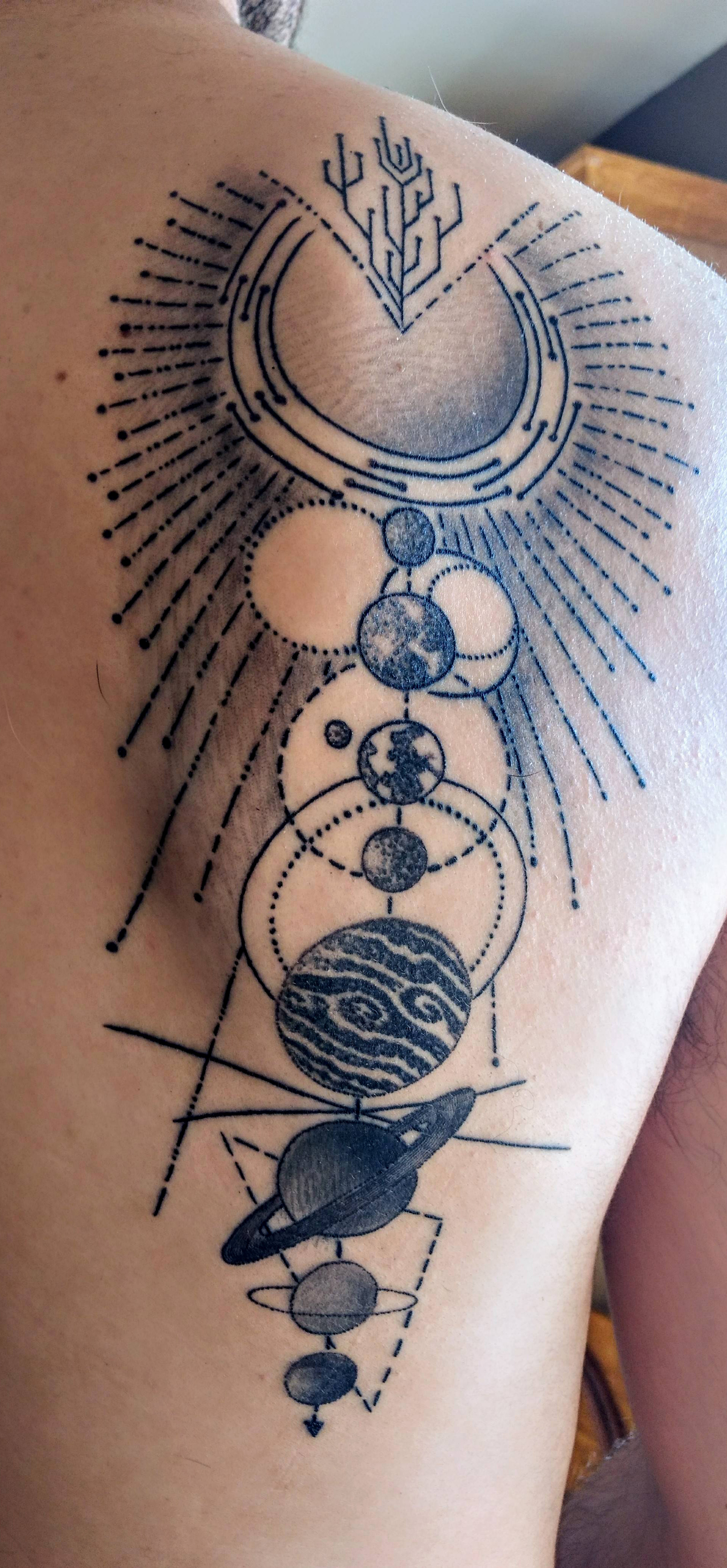 Geometric solar system done by Blaine at Art and Soul Tattoos in Kalamazoo MI