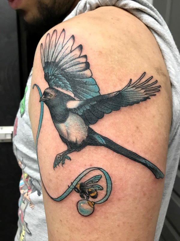 Magpie Bee tattoo by Carol Tattersal at Archive studio in Toronto