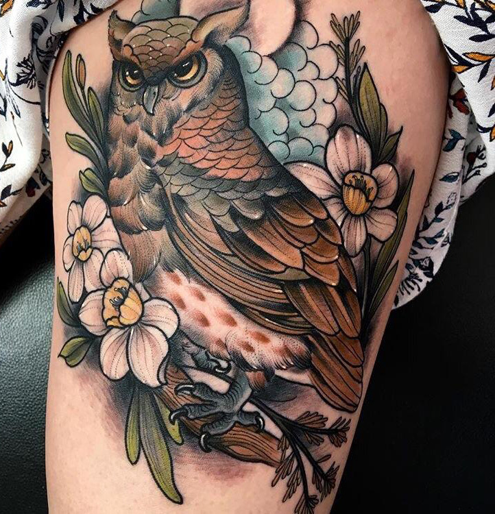 Owl, daffodils and moon by Shaun Dean, Emerald fox Tattoos, Cape Town