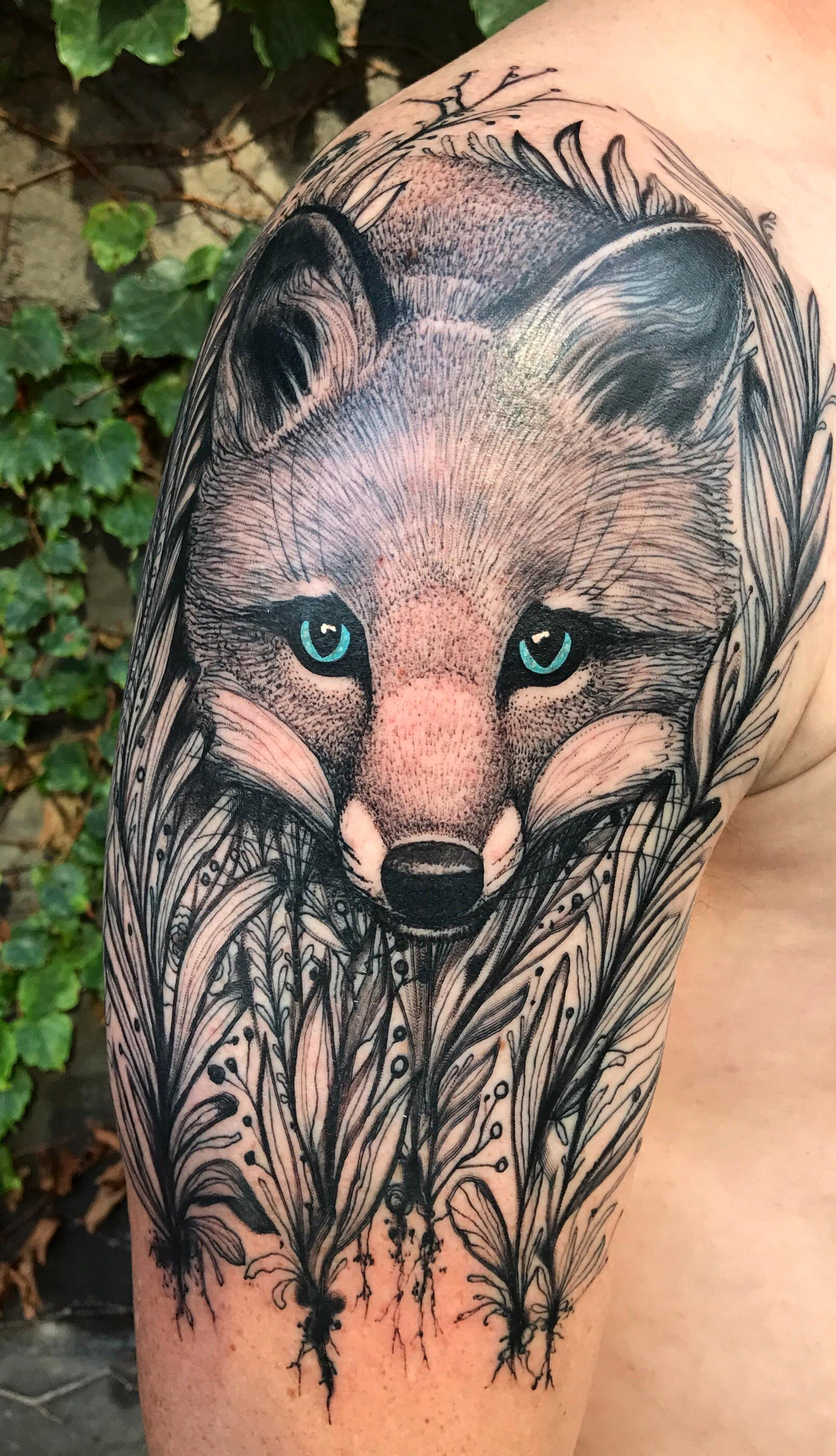 A fox in the ferns. Tattoo by Dino Nemec at Lone Wolf studio in Columbus, Ohio